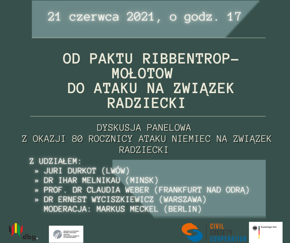Towarzystwo Niemiecko-Białoruskie oraz Fundacja Współpracy Polsko-Niemieckiej chcą upamiętnić 80 rocznicę inwazji Wehrmachtu na Związek Radziecki w panelu dyskusyjnym, który nadaje temu brzemiennemu w skutkach wydarzeniu szerszy kontekst i przedstawia je z perspektywy Białorusi i Ukrainy. To przede wszystkim te dwie ówczesne republiki radzieckie jako pierwsze doświadczyły ataku Wehrmachtu 22 czerwca 1941 r. Jednocześnie data ta nie wyznacza dla nich początku wojny i przemocy. Początkiem był 17 września 1939 r., kiedy to Armia Czerwona, zgodnie z ustaleniami paktu Ribbentrop-Mołotow, zajęła wschodnie tereny Polski i siłą ustanowiła swoje rządy w takich miastach jak Brześć, Grodno i Lwów.