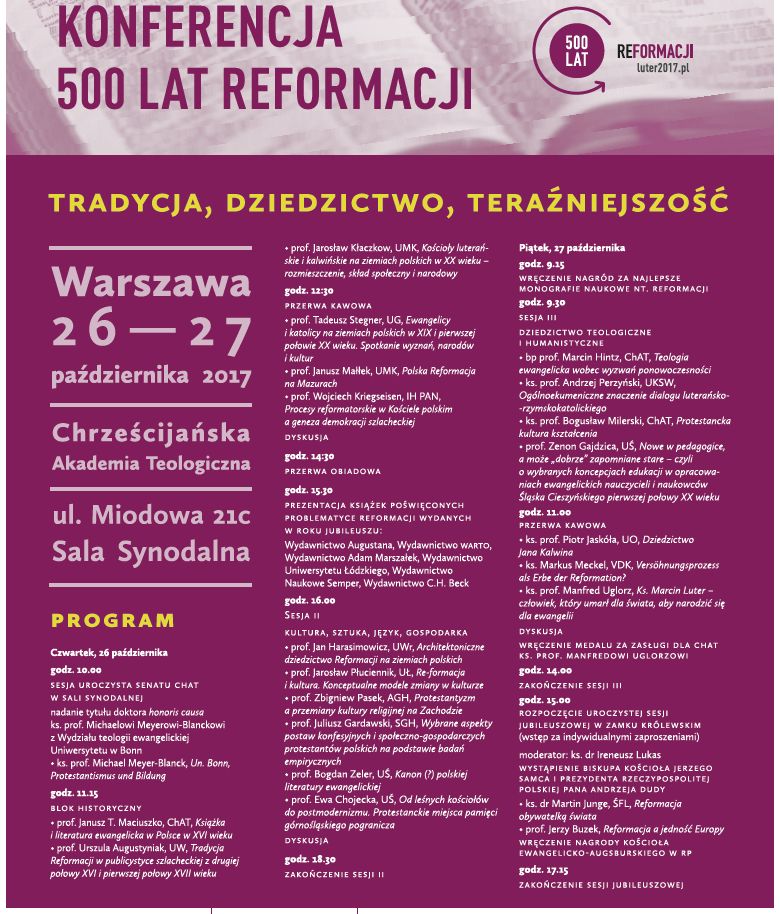 26 października 2017 r. w Warszawie Centralne Obchody Jubileuszu 500 lat Reformacji rozpoczęły się od konferencji „500 lat Reformacji. Tradycja, dziedzictwo, teraźniejszość” w Chrześcijańskiej Akademii Teologicznej. Podczas konferencji odbyła się uroczystość nadania przez Senat ChAT tytułu doktora honoris causa ks. prof. Michaelowi Meyerowi-Blanckowi z Wydziału Teologii Ewangelickiej Uniwersytetu w Bonn. Laureat wygłosił wykład „Protestantyzm i Edukacja”. Fundacja Współpracy Polsko-Niemieckiej jest partnerem Centralnych Obchodów Jubileuszu 500 lat Reformacji, które potrwają do 29 października.