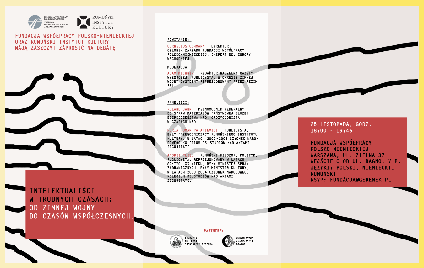 25 listopada FWPN, Rumuński Instytut Kultury i Fundacja im. Bronisława Geremka zapraszają na debatę z udziałem z udziałem Rolanda Jahna, Horii-Romana Patapievici i Andreia Andrei Pleșu. Moderacja: Adam Michnik.