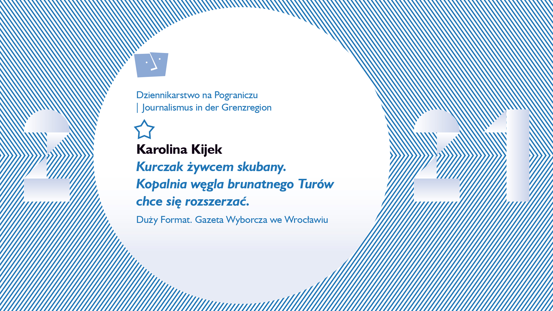 Juror w kategorii Prasa Uwe Rada o decyzji jury: „W reportażu „Kurczak żywcem skubany“ polska sztuka reportażu po raz kolejny bierze pod lupę polsko-niemieckie pogranicze. Reportaż Kijek poświęcony jest kopalni odkrywkowej Turów zlokalizowanej w trójkącie granicznym Polski, Niemiec i Czech. Siła reportażu Karoliny Kijek polega na jego wielogłosowości. Czytelnicy odnajdą w nim bowiem różne spojrzenia na kwestie energetyki opartej na węglu brunatnym, zmian klimatycznych i polityki energetycznej. Nie znajdą w nim jednej prostej prawdy. Region polsko-niemieckiego pogranicza opisywany jest często w kontekście porozumienia i współpracy pomiędzy obydwoma państwami. W swoim reportażu Karolina Kijek decyduje się jednak dotknąć miejsc bolesnych. Opisując konflikt, z którego prawdopodobnie wyłonią się sami przegrani. Dlatego to w pełni zasłużona nagroda”.