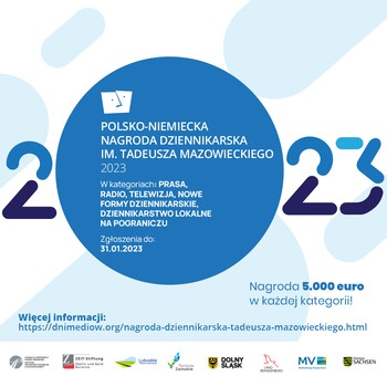 Startuje kolejna edycja konkursu o Polsko-Niemiecką Nagrodę Dziennikarską im. Tadeusza Mazowieckiego. Prasa, Radio, Telewizja, Nowe formy dziennikarskie i „Dziennikarstwo lokalne na pograniczu” to nazwy tegorocznych kategorii w konkursie. Kategoria Nowe formy dziennikarskie obejmuje nie tylko multimedialne projekty dziennikarskie, ale też podcasty oraz materiały wideo o tematyce polsko-niemieckiej. Jury przyzna nagrody pieniężne w łącznej wysokości 25 000 euro. Zwycięzcy i zwyciężczynie zostaną nagrodzeni podczas gali w ramach Polsko-Niemieckich Dni Mediów w województwie lubuskim 15 czerwca 2023 roku.