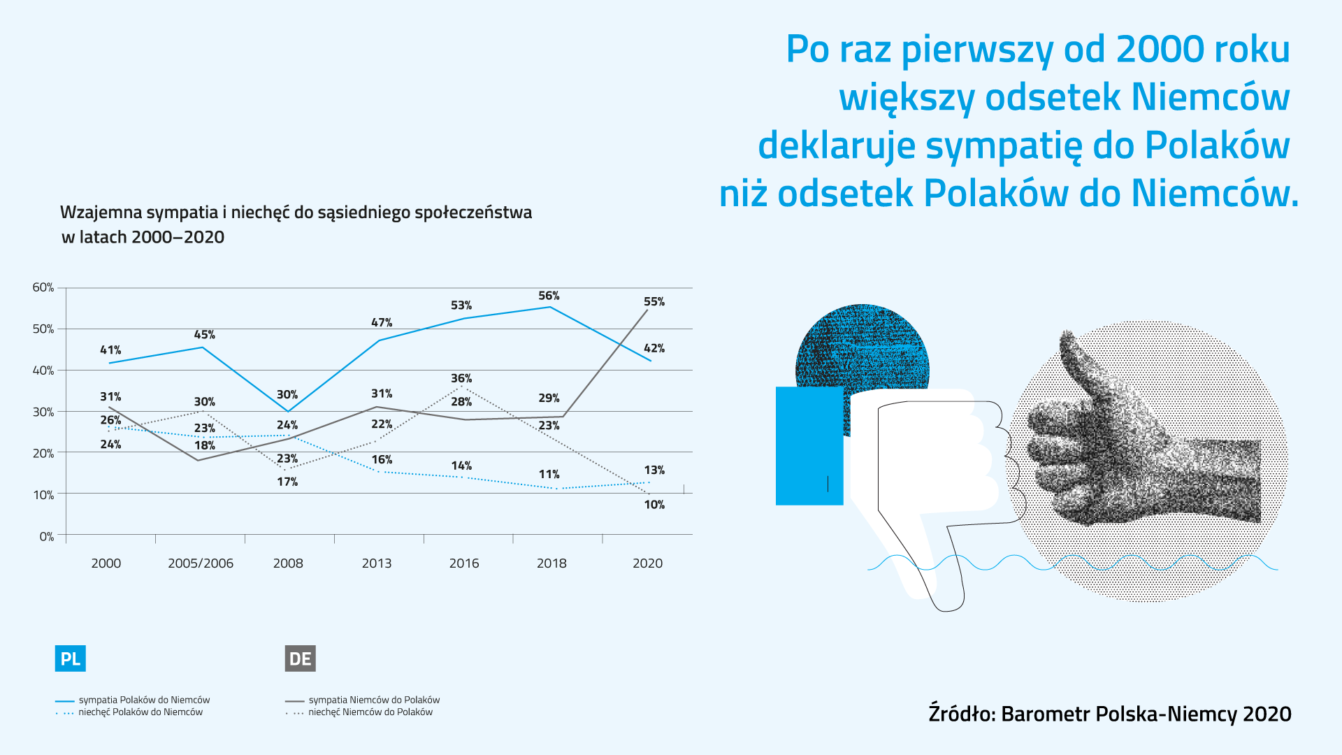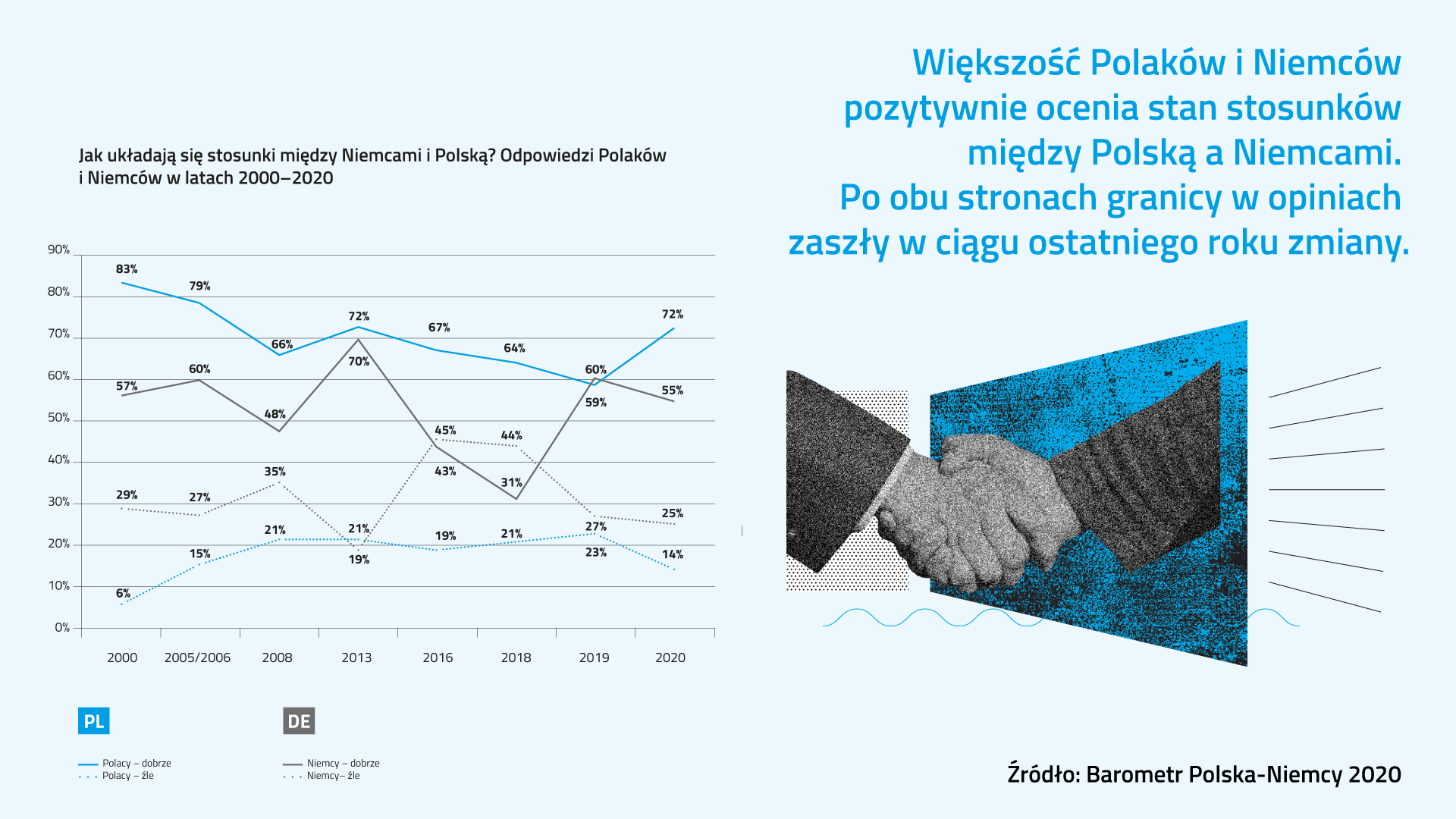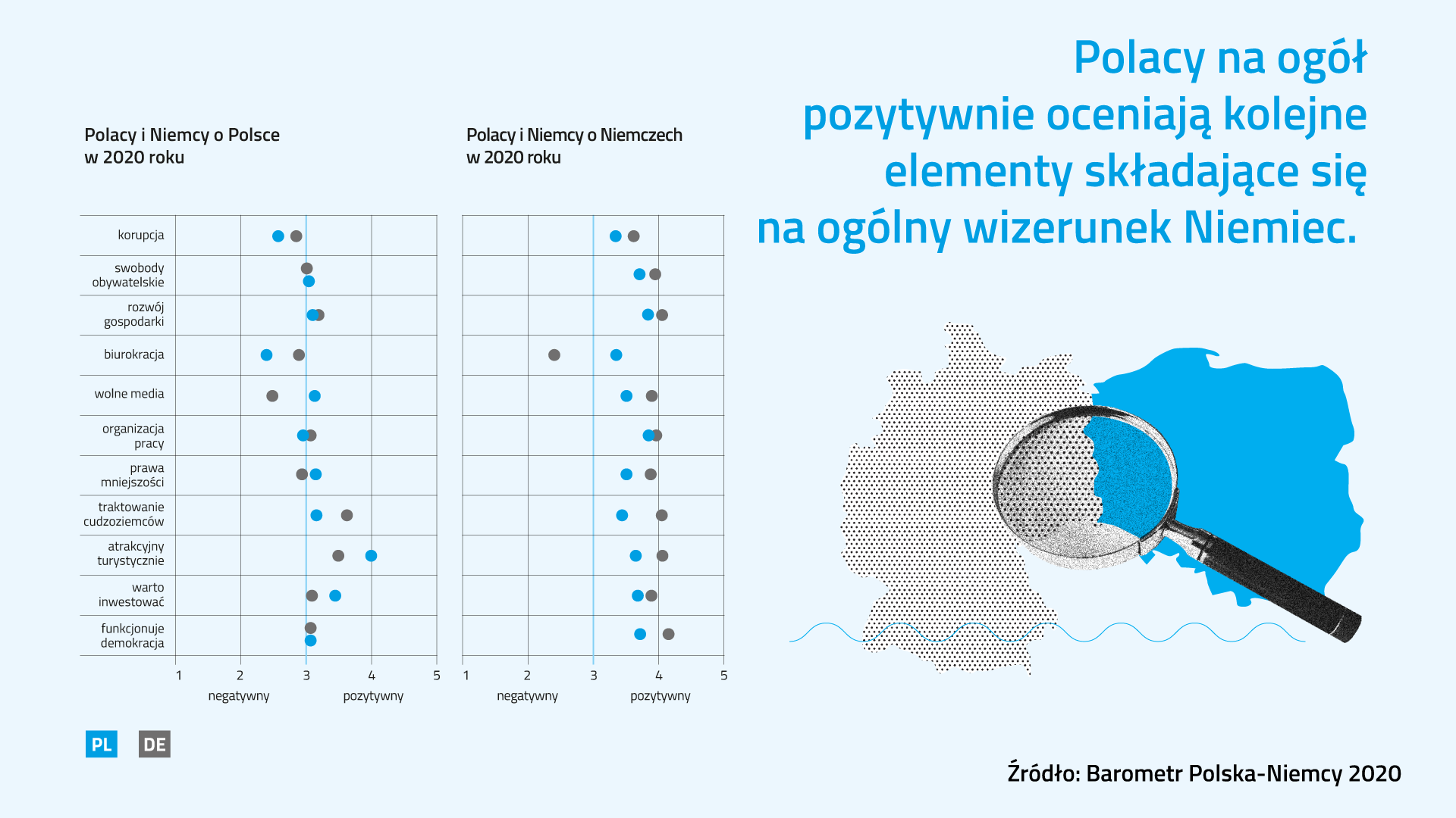 Badania z serii Barometr Polska-Niemcy prowadzone są przez Instytut Spraw Publicznych i Fundację Konrada Adenauera, obecnie również z Deutsches Polen-Institut i Fundacją Współpracy Polsko-Niemieckiej od 2000 roku. Pozwalają one obserwować dynamikę zmian we wzajemnym wizerunku Polaków i Niemców. Do tej pory zwłaszcza obraz Niemiec w Polsce był dobry i ulegał poprawie. W porównaniu do badań z 2018 roku wizerunek Niemiec w Polsce pogorszył się. Odsetek pozytywnych opinii o rozwoju gospodarki czy funkcjonowania państwa spadł, ale nie wzrósł jednocześnie odsetek ocen negatywnych. Więcej Polaków wystawia za to oceny ambiwalentne. Obraz Niemiec w oczach Polaków jest jednocześnie lepszy niż obraz własnego kraju. „Opinie Polaków na przykład na temat stanu polskiej demokracji czy gospodarki są bardzo podzielone i związane z ich preferencjami politycznymi,” opisuje te dane dr Jacek Kucharczyk z Instytutu Spraw Publicznych, współautor raportu z badania. „Z kolei niemieccy badani oceniają Polskę jako kraj lepiej niż w 2018 roku (kiedy zanotowano regres ocen pozytywnych), ale nadal około połowy Niemców nie ma opinii lub ma ambiwalentne opinie o Polsce, kiedy oceniają funkcjonowanie polskiej demokracji, wolność mediów, poziom korupcji czy biurokracji. Natomiast niemieckie oceny o własnym państwie są zdecydowanie pozytywne” dodaje.