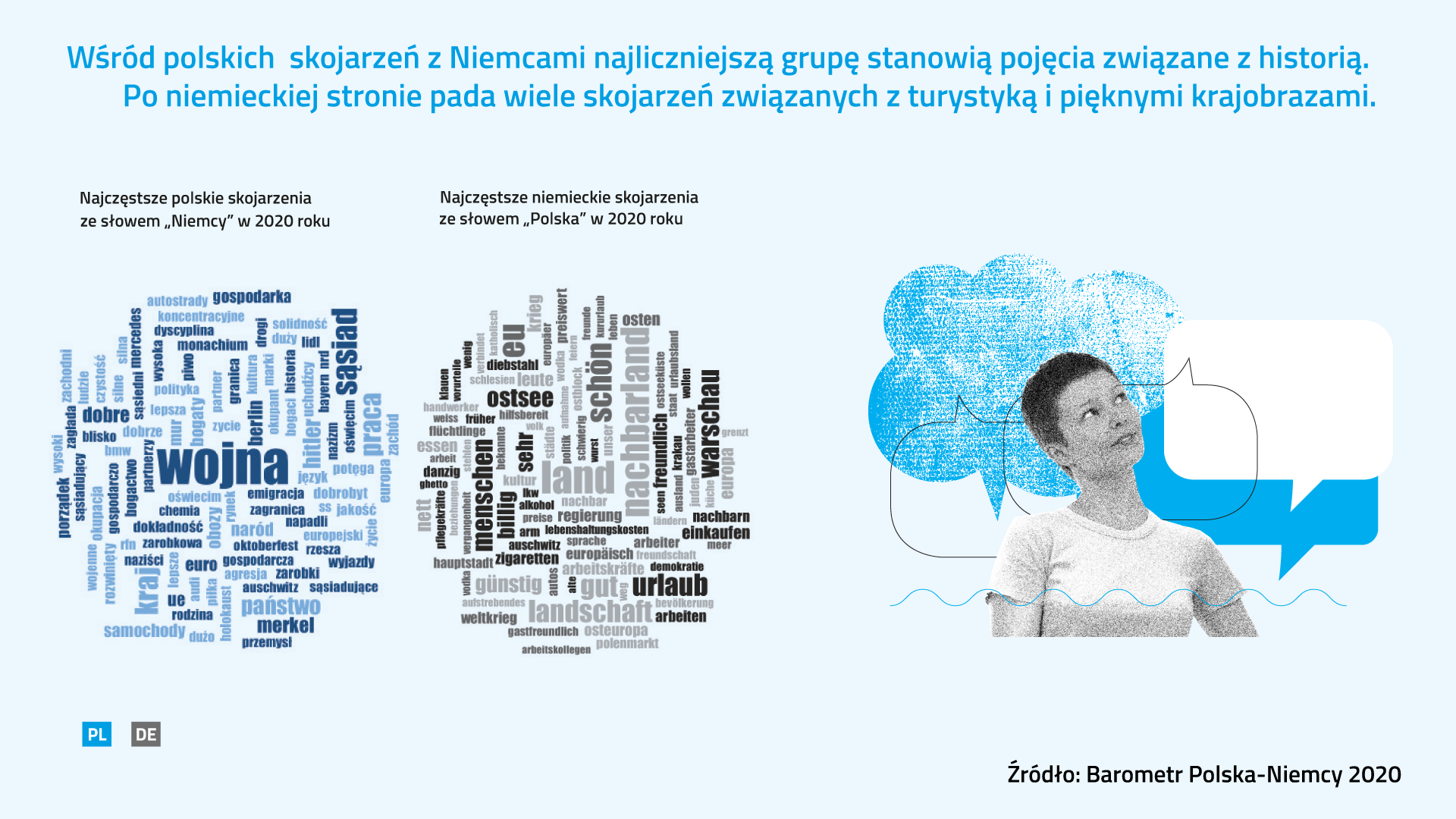 Większość Polaków (52%) i Niemców (66%) uważa, że w relacjach polsko-niemieckich należy koncentrować się na teraźniejszości i przyszłości, choć odsetek Polaków tak twierdzących przez lata się zmniejszał (w 2011 roku – 73%, w 2018 roku – 60%). W 2020 roku 36% Polaków uważa, że przede wszystkim trzeba się skupić na przeszłości. Po niemieckiej stronie zmiana jest mniejsza. Odsetek badanych, którzy preferują zajmowanie się we wzajemnych relacjach teraźniejszością i przyszłością, spadł o cztery punkty procentowe, podczas gdy odsetek osób wybierających przeszłość wzrósł o sześć punktów procentowych.