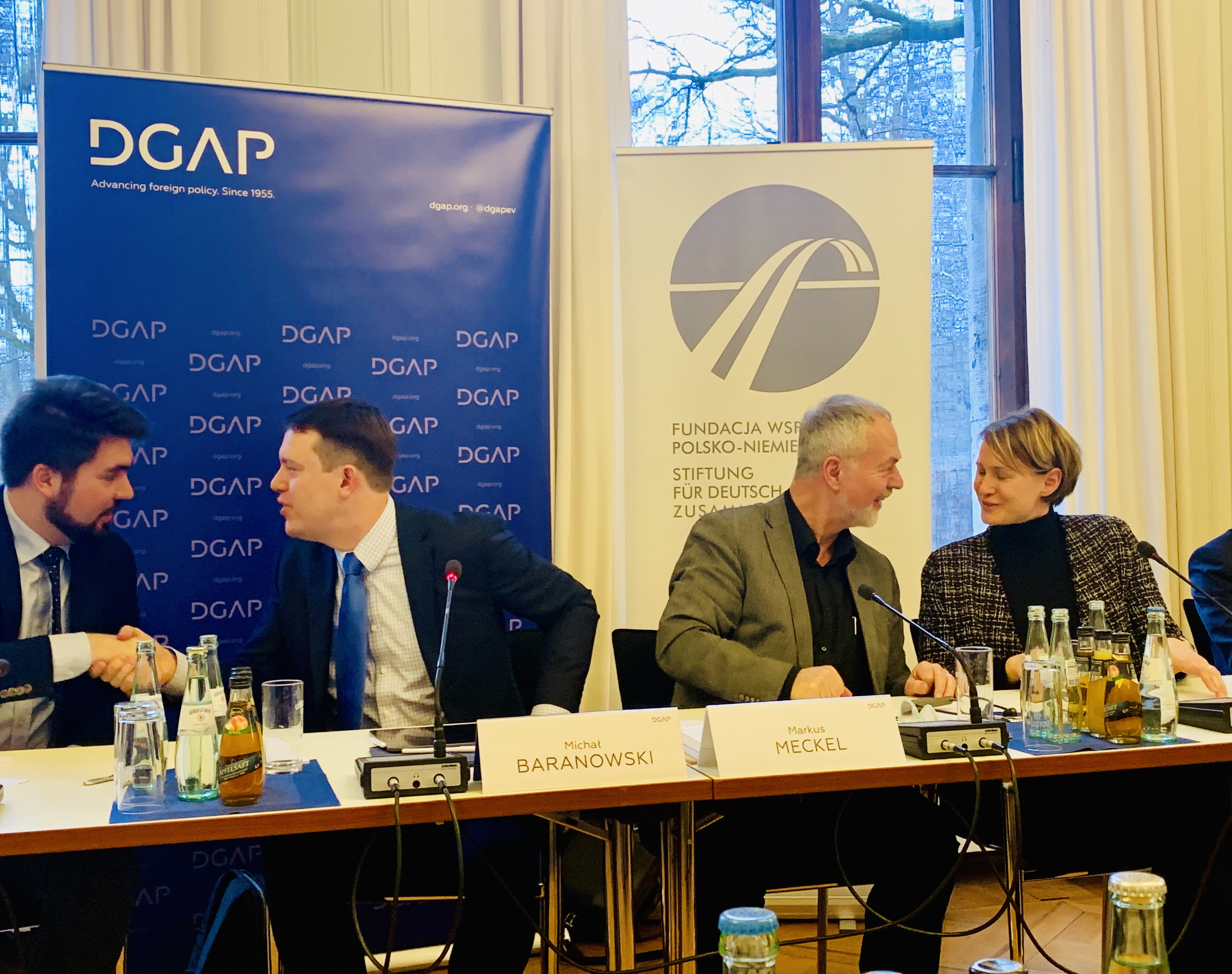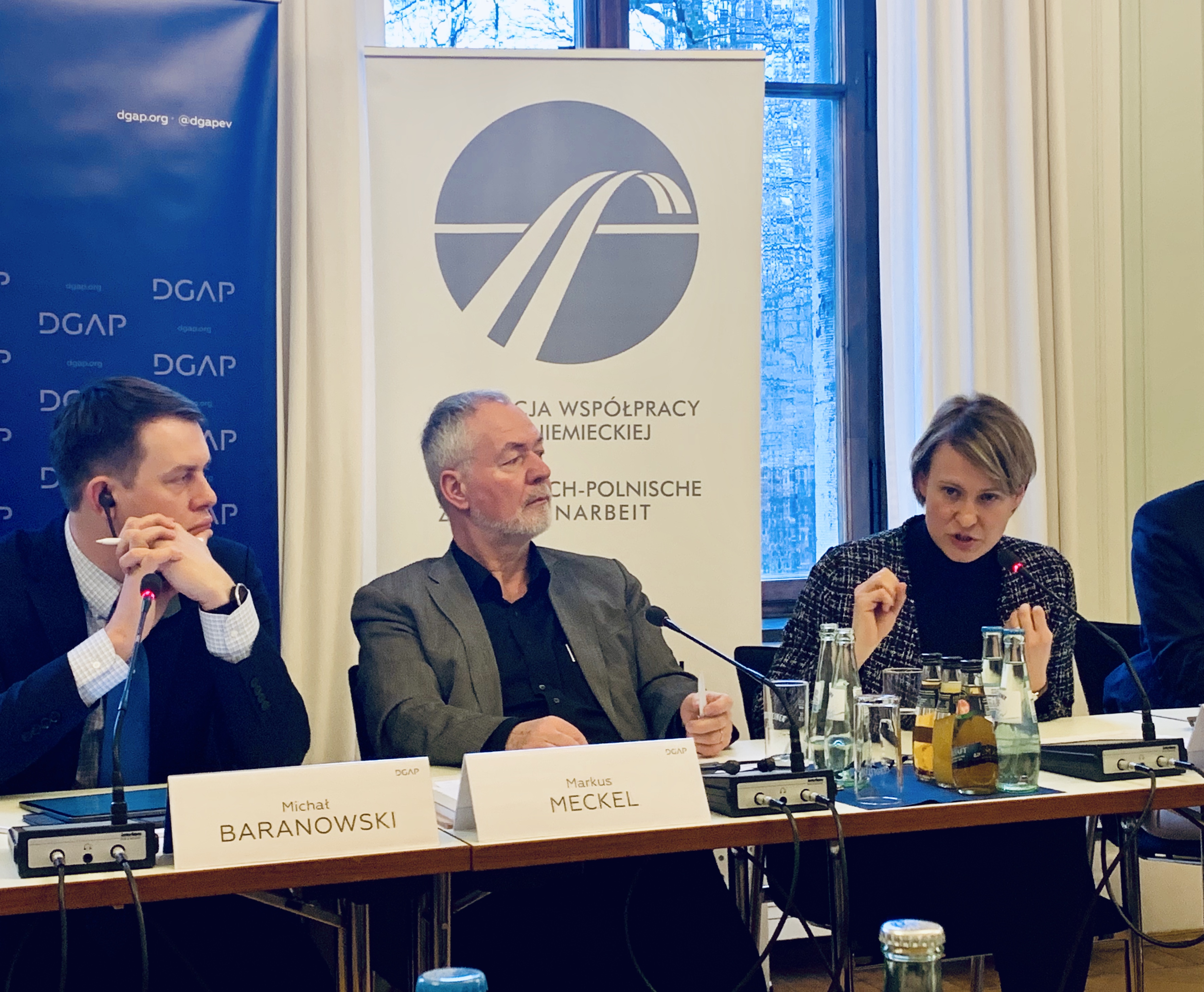 Michał Baranowski, dyrektor warszawskiego biura German Marshall Fund, wyjaśniał obecnym gościom, dlaczego ciągłe stawianie na sojusz ze Stanami Zjednoczonymi e jako jedyny gwarantujący bezpieczeństwo Polski jest ponadpartyjnym konsensusem. Jana Puglierin, właśnie nominowana nowa dyrektor berlińskiego biura Europejskiej Rady Spraw Zagranicznych (ECFR), określiła podejście niemieckiej polityki zagranicznej, w tym bezpieczeństwa, jako „strategiczną cierpliwość” ubogą w treści, ale stawiającą na powściągliwość.