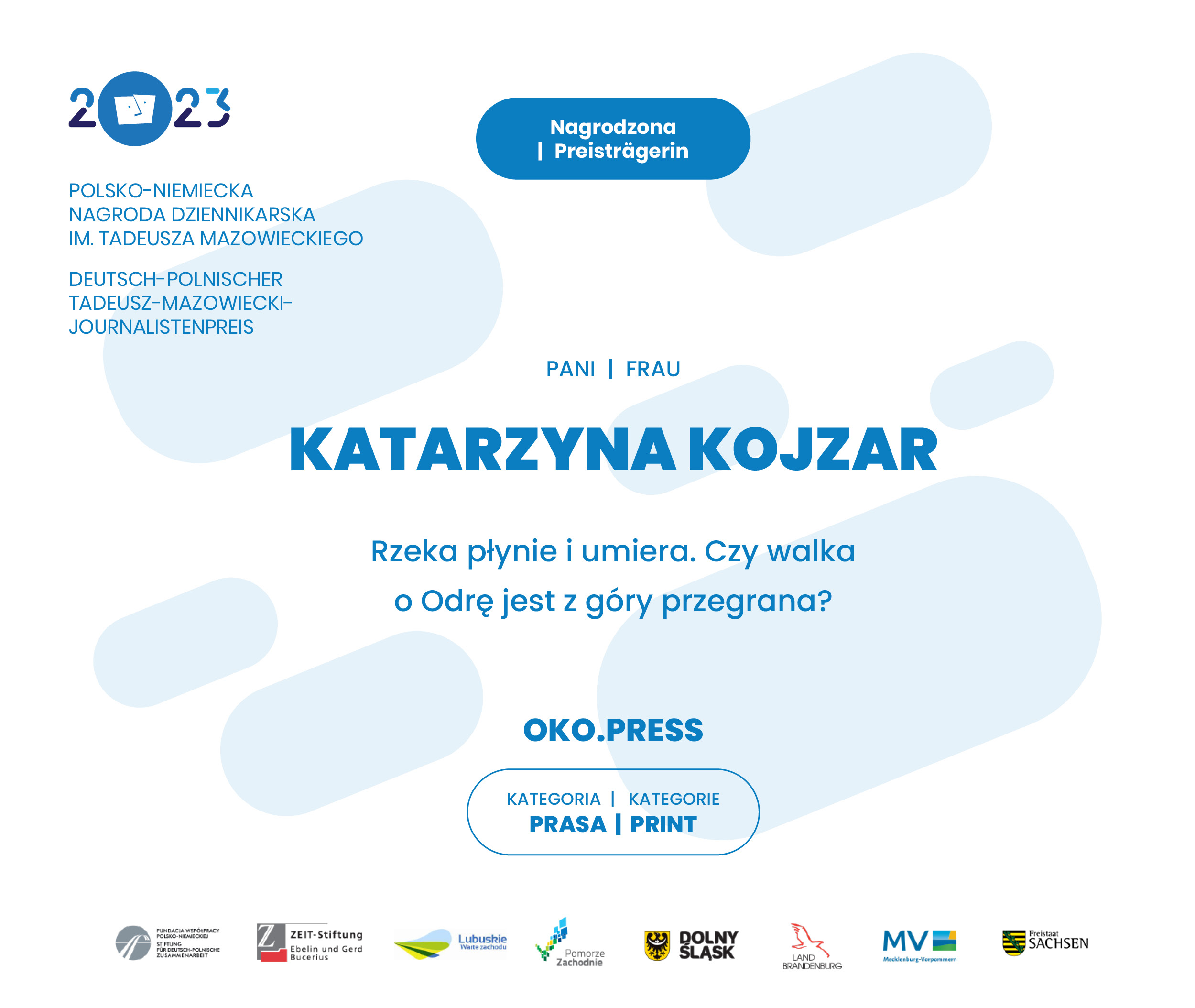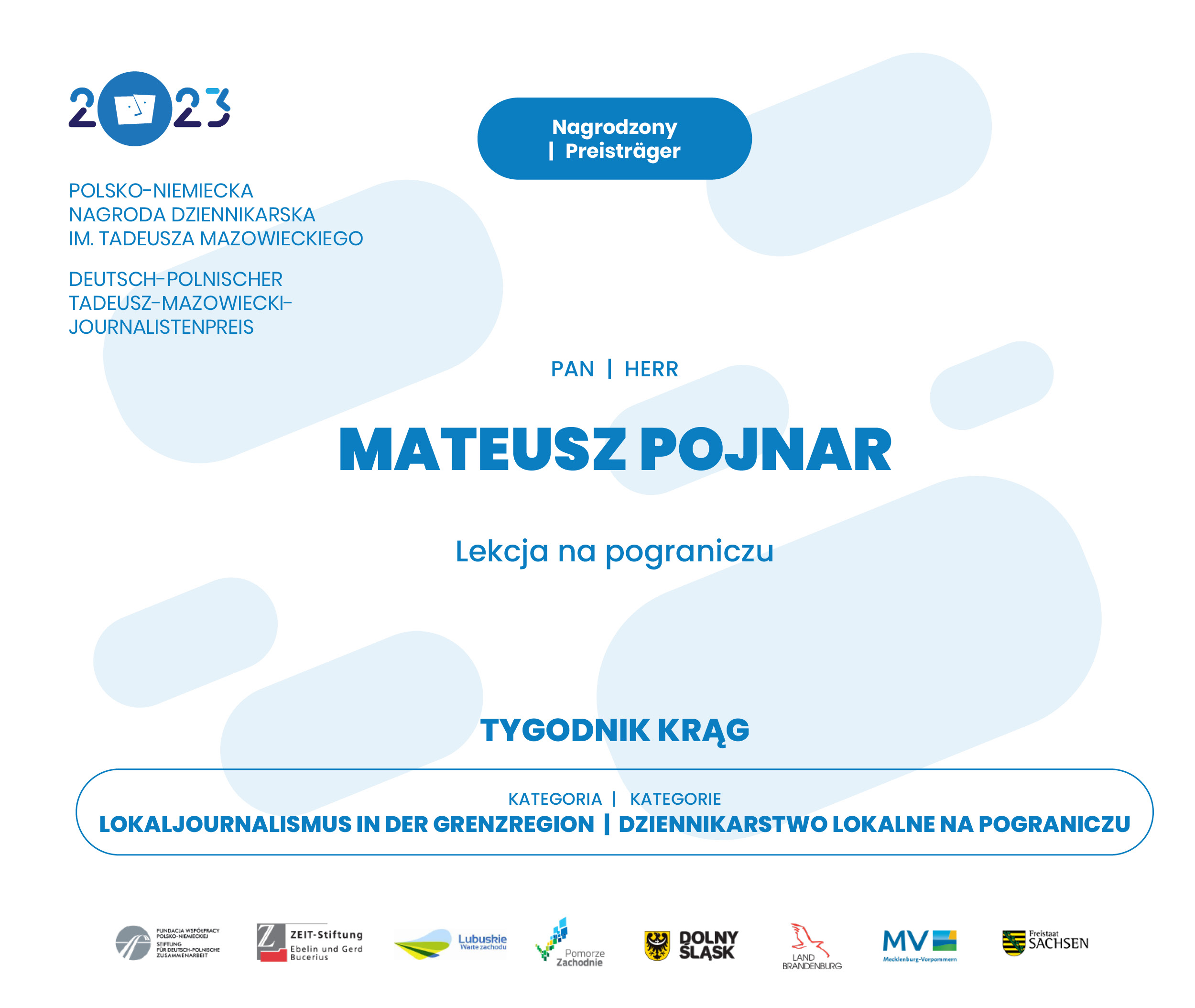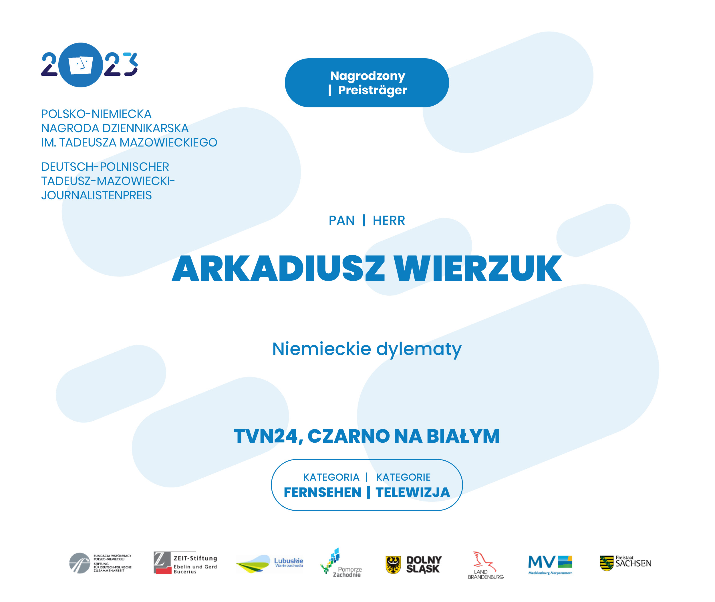 Polsko-Niemiecką Nagrodę Dziennikarską im. Tadeusza Mazowieckiego 2023 otrzymują: Katarzyna Kojzar, Ernst-Ludwig von Aster i Anja Schrum, Arkadiusz Wierzuk, Franziska Hentsch, Petr Kumpfe, Tomasz Sikora, Holger Lühmann, Peggy Wolter, Roman Nuck, Stefan Schmidt oraz Mateusz Pojnar.