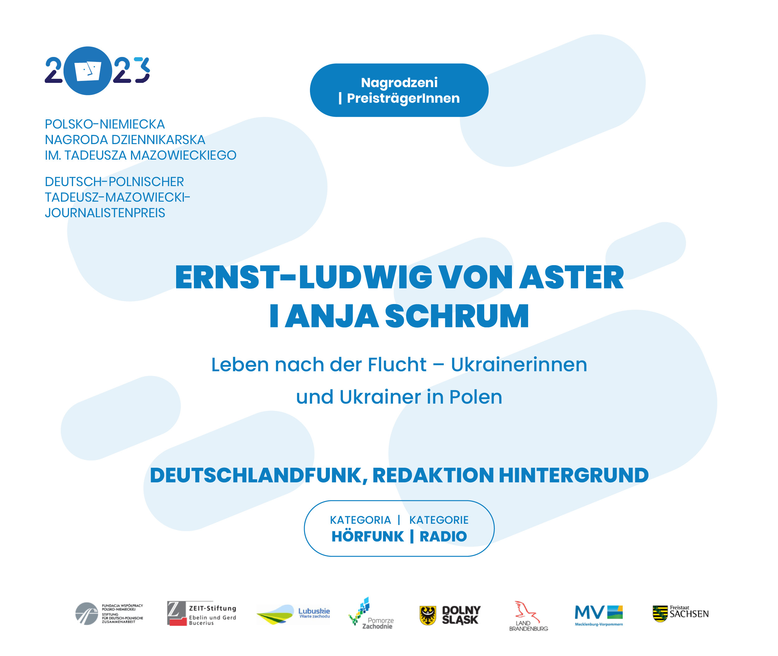 Nagrodę za reportaż „Życie po ucieczce – Ukrainki i Ukraińcy w Polsce”, wyemitowany w rozgłośni Deutschlandfunk z redakcji Hintergrund, autorzy Ernst-Ludwig von Aster i Anja Schrum odebrali z rąk Dietmara Nietana, koordynatora rządu federalnego ds. niemiecko-polskiej współpracy międzyspołecznej i transgranicznej. „Przedstawione w materiale losy uchodźców i uchodźczyń wojennych z Ukrainy, ogromna gotowość do niesienia pomocy polskiego społeczeństwa, ale także codzienne trudności po przybyciu do Polski, nadzieja na normalność, integrację i nowy początek – wszystko to tworzy wybitny i poruszający reportaż” – powiedział Dietmar Nietan.