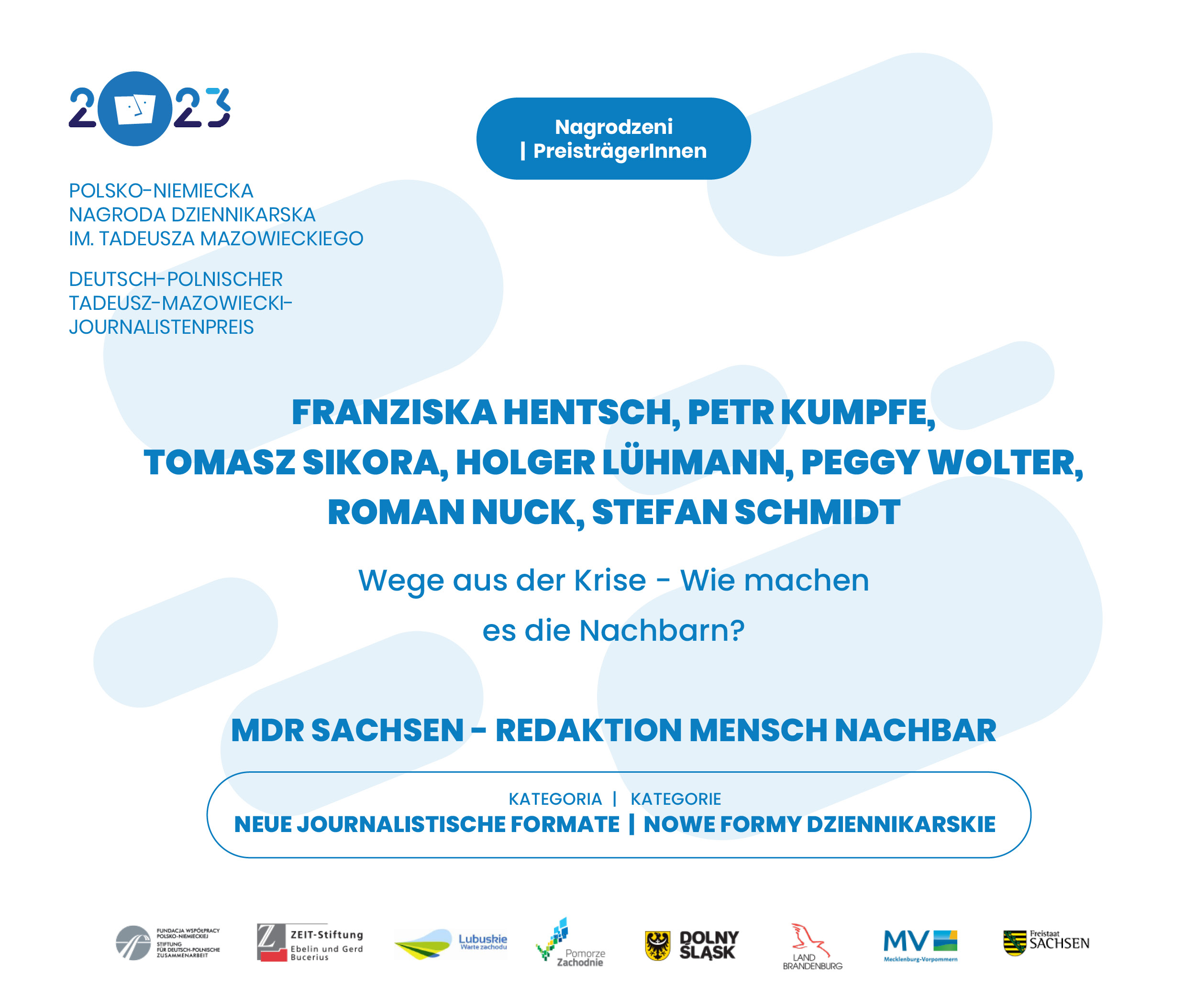 Polsko-Niemiecką Nagrodę Dziennikarską otrzymał zespół MDR Sachsen, redakcja Mensch, Nachbar w składzie Franziska Hentsch, Petr Kumpfe, Tomasz Sikora, Holger Lühmann, Peggy Wolter, Roman Nuck, Stefan Schmidt.