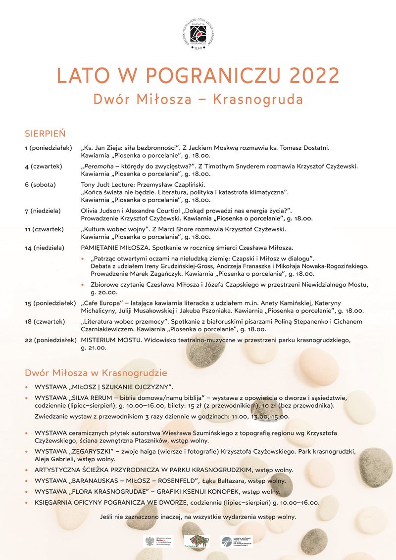Spotkanie z uczestnikami programu rezydencyjnego "Rozmów ciąg dalszy – polsko-niemiecko- białoruski program rezydencji dla autorów z Białorusi" w kawiarnii literackiej "Piosenka o porcelanie" w Krasnogrudzie. Spotkanie poprowadzi Krzysztof Czyżewski.
