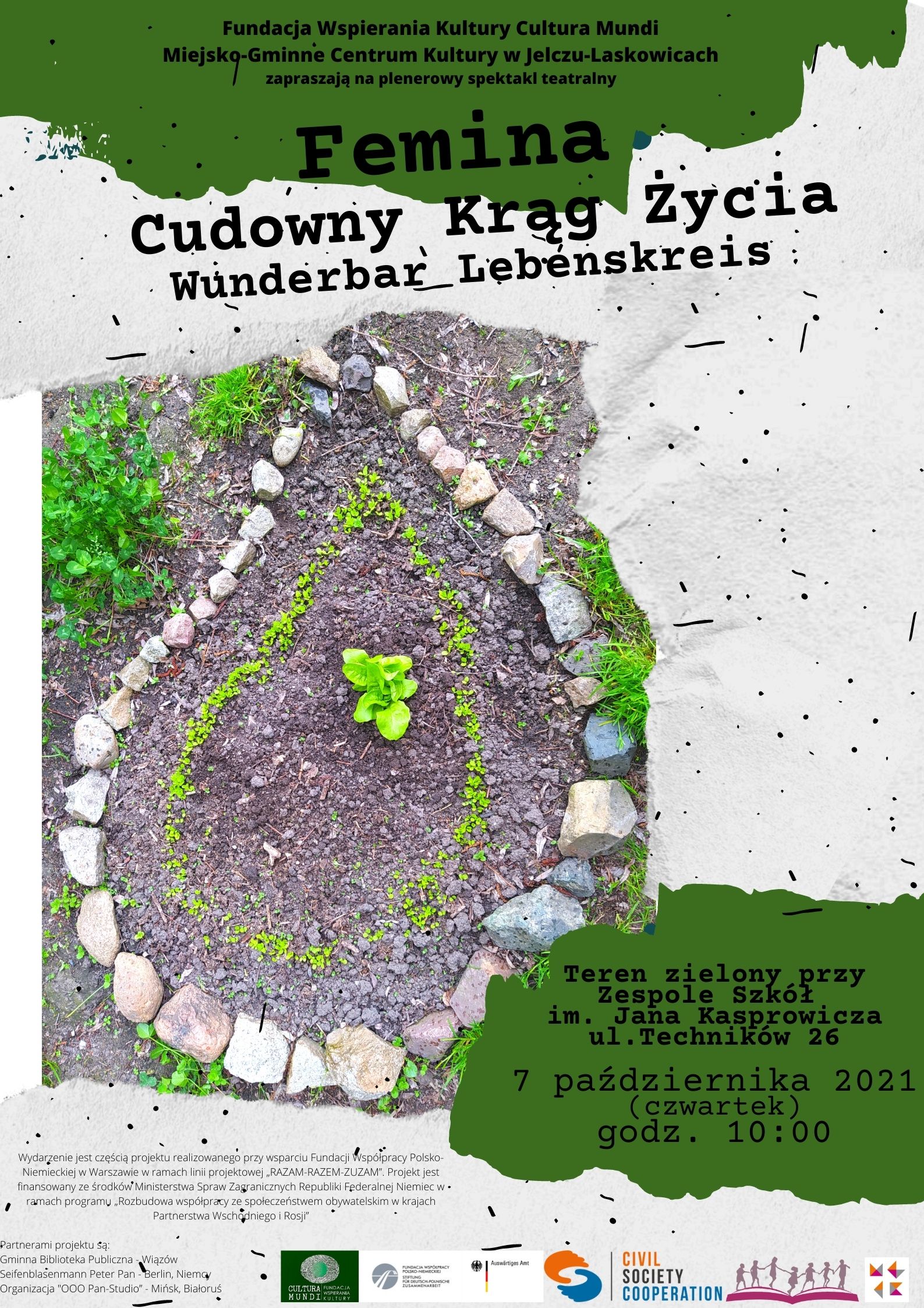 PL Program FWPN " Razam Razem Zuzam" Spektakl pt. " Femina - Cudowny Krąg Życia " - spektakl teatralny mówiący o niezwykłym cyklu rodzenia się i obumierania człowieka, jego dorastaniu , inicjacji, zmagania się z własnymi ograniczeniami oraz wchodzenia w relację z drugim człowiekiem. Kobieta jako odwieczny symbol symbiozy z naturą i zgodności z cyklem księżyca, urasta tu do rangi symbolu i kanwy, na którym został oparty scenariusz spektaklu. Mężczyzna jako jej przeciwieństwo stanowi niejako przeciwległy biegun a jednocześnie dopełnienie harmonii Przedstawienie będzie zaprezentowanie w Polsce w 4 miastach Dolnego Śląska do 50.000tys mieszkańców, które nie posiadają na swoim terenie Teatru instytucjonalnego. Wielu odbiorców jest odciętych od dóbr kultury. Spektakl z udziałem 2 aktorów z Niemiec, 2 aktorów Polski, oraz 3 aktorów z Białorusi. Na spektakl będzie zaproszona lokalna społeczność oraz młodzież ze szkół ponad podstawowych głownie z klas o profilu germanistycznym. Spektakl realizowany będzie we współpracy z lokalnymi instytucjami Kultury w poszczególnych 4 miastach Dolnego Śląska
