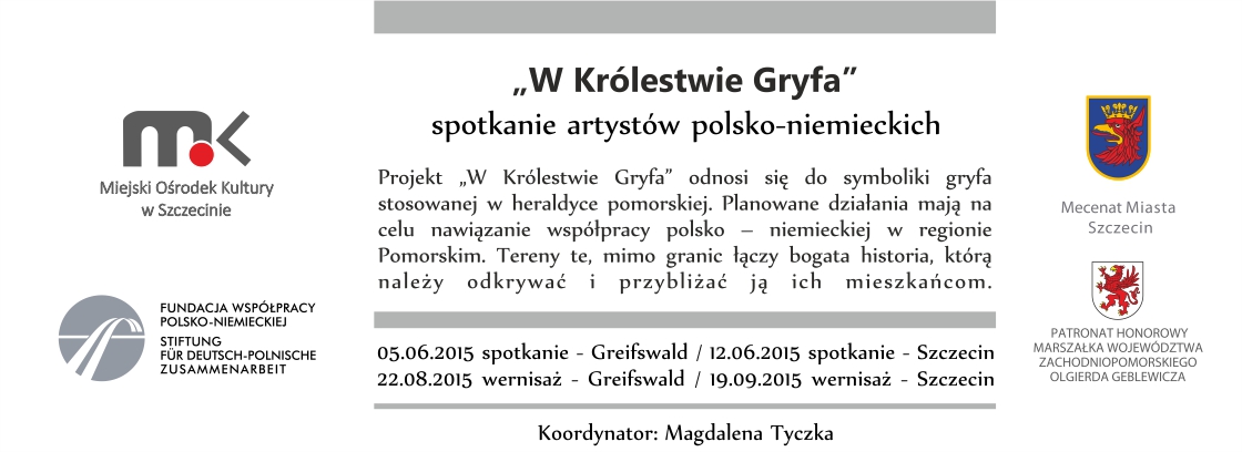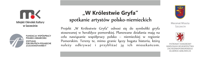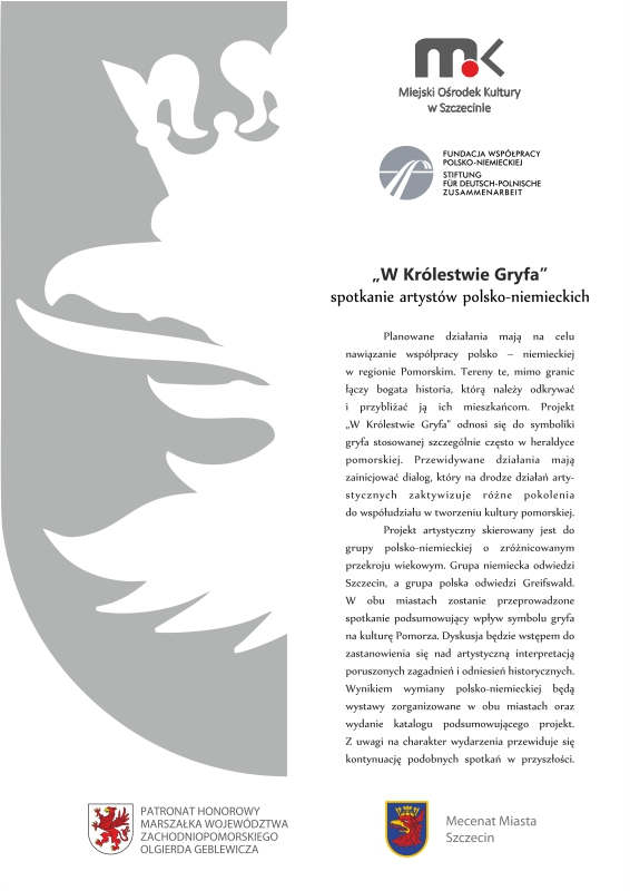 Projekt „W Królestwie Gryfa” odnosi się do symboliki gryfa stosowanej szczególnie często w heraldyce pomorskiej. Przewidywane działania mają zainicjować dialog, który na drodze działań arty-stycznych zaktywizuje różne pokolenia do współudziału w tworzeniu kultury pomorskiej. Projekt artystyczny skierowany jest do grupy polsko-niemieckiej o zróżnicowanym przekroju wiekowym. Wynikiem wymiany polsko-niemieckiej będą wystawy zorganizowane w obu miastach oraz wydanie katalogu podsumowującego projekt. Z uwagi na charakter wydarzenia przewiduje się kontynuację podobnych spotkań w przyszłości.