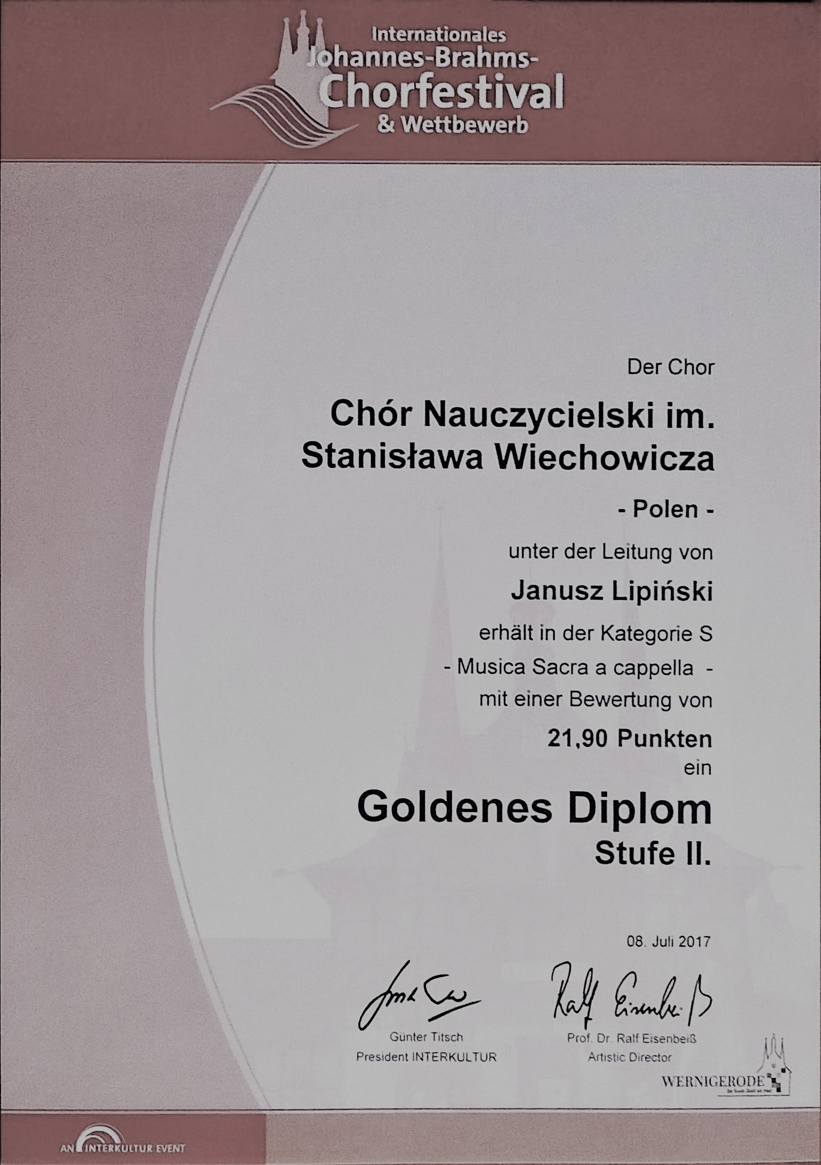 Ostrowski CHÓR NAUCZYCIELSKI im. Stanisława Wiechowicza, pracujący pod kierunkiem Janusza Lipińskiego wrócił z Wernigerode, gdzie uczestniczył w bardzo prestiżowym 10. Międzynarodowym Festiwalu i Konkursie Chóralnym im. Johannesa Brahmsa.