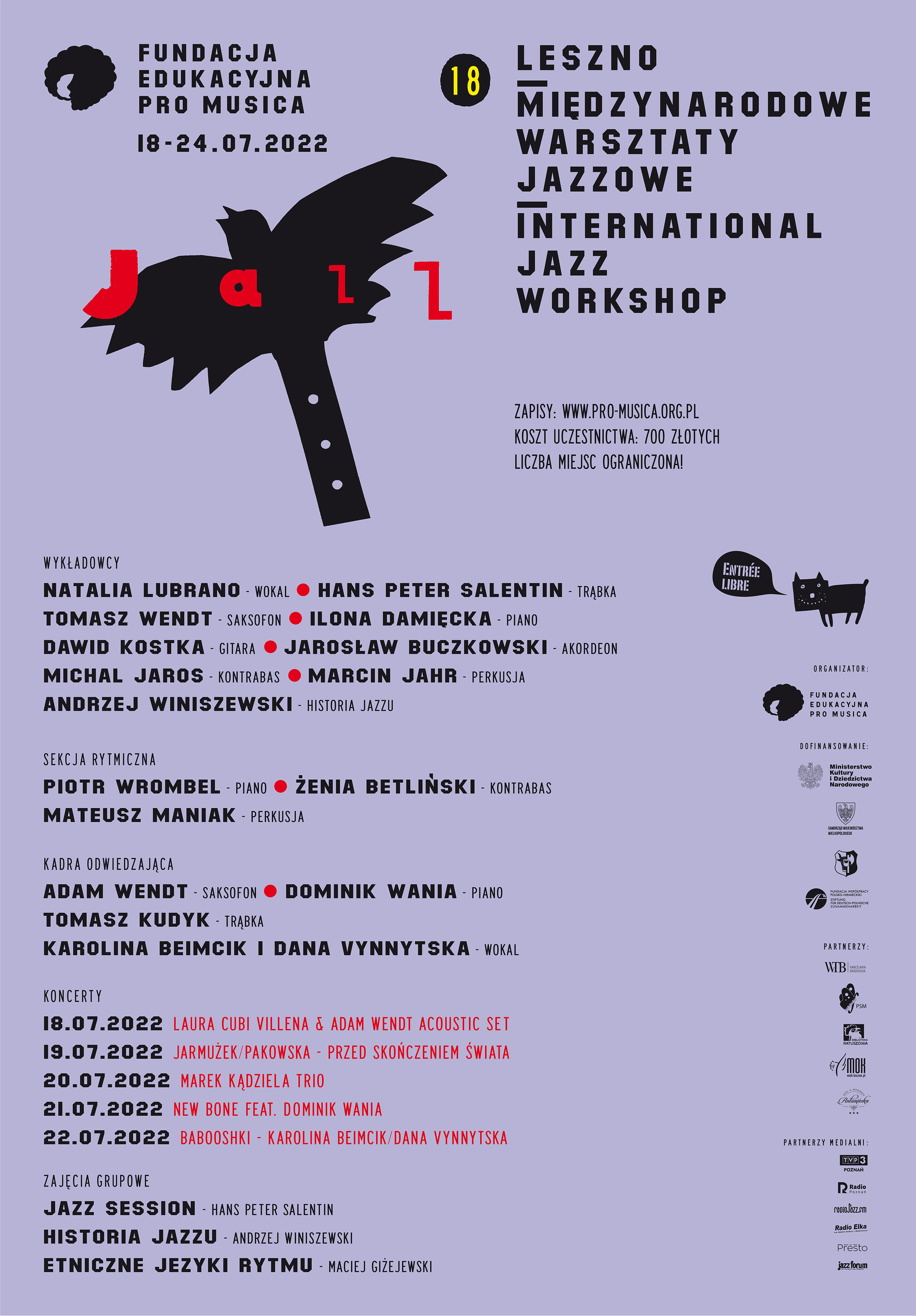 18. Międzynarodowe Warsztaty Jazzowe w Lesznie odbędą się w dniach 18 - 24 lipca. Warsztaty od wielu lat cieszą się opinią jednego z najciekawszych i najbardziej twórczych projektów artystycznych i muzycznych w Polsce. Odbywają się w ciepłej, kameralnej atmosferze z udziałem znakomitych wykładowców, dbających o najwyższy poziom zajęć. Co roku wielkim świętem jazzu jest koncert finałowy leszczyńskich warsztatów, w czasie którego uczestnicy prezentują swoje twórcze możliwości. Organizatorką i szefową Międzynarodowych Warsztatów Jazzowych w Lesznie jest od początku wokalistka, pianistka i kompozytorka Julia Sawicka.