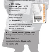 Od: 5 listopada 2009 Do: 5 listopada 2009 KrakówGoethe-Institut w Krakowie, Fundacja S. Fischer Stiftung oraz Wydawnictwo Homini zapraszają na spotkanie z pisarką niemiecką Petrą Morsbach autorką powieści "Sługa boży". Książkę wydano z finansowym wsparciem Fundacji Współpracy Polsko-Niemieckiej.