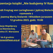 Od: 12 grudnia 2023 Do: 12 grudnia 2023 ul. Zielna 37, WarszawaRozmowa o książce „Nie budujemy IV Rzeszy” Fundacja Współpracy Polsko-Niemieckiej i wydawnictwo Bellona zapraszają na spotkanie poświęcone książce „Nie budujemy IV Rzeszy”. Jest to wywiad-rzeka jakiego udzielił Arndt Freytag von Loringhoven, ambasador Niemiec w Polsce w latach 2020-2022, Jędrzejowi Bieleckiemu, dziennikarzowi „Rzeczpospolitej”. Spotkanie poprowadzą Joanna Maria Stolarek i Witold Jurasz. Ich rozmówcami będą ambasador Arndt Freytag von Loringhoven i Jędrzej Bielecki. Zapraszamy we wtorek 12.12.2023 na godz. 19:00 do siedziby Fundacji Współpracy Polsko-Niemieckiej na ul. Zielną 37 w Warszawie (Sala Warszawa 5 piętro). RSVP do 8 grudnia: whatsnext@fwpn.org.pl Po spotkaniu zapraszamy na poczęstunek • Czy gdyby nie grube miliardy euro zapłacone przez Niemcy za rosyjski gaz, Władimir Putin miałby środki na inwazję na Ukrainę? • Czy Śląsk, Pomorze i Mazury należy zaliczyć na poczet reparacji, jakie Niemcy wypłaciły Polsce za drugą wojnę światową? • Czy można nie być nazistą, pozostając jak ojciec Arndta Freytaga von Loringhovena wiele miesięcy z Hitlerem w bunkrze pod Kancelarią Rzeszy? • Dlaczego Berlin prowadzi dziś wobec Europy Wschodniej politykę Jerzego Giedroycia, tylko o tym nie wie? • Czy Niemcy będą broniły Polski w razie inwazji Rosji na nasz kraj? • Co usłyszał ambasador Niemiec od prezesa PiS? • Czy Angela Merkel obiecała Jarosławowi Kaczyńskiemu, że Donald Tusk nie będzie wybrany na drugą kadencję na przewodniczącego Rady Europejskiej? • Czy Niemcy chciały wysłać swoje wojska do Polski, gdy zaczęła się wojna w Ukrainie? • Czy Niemcy są gotowe wziąć udział w odbudowie Pałacu Saskiego? • Czy kanclerz Merkel naprawdę wierzyła, że Nord Stream 2 to projekt wyłącznie biznesowy? • Dlaczego Niemcy wiedzą wiele o Holokauście, ale mało o mordach na Polakach, którzy nie mieli żydowskiego pochodzenia? Oto tylko niewielka część pytań, z którymi w tej książce zmierzył się Arndt Freytag von Loringhoven.
