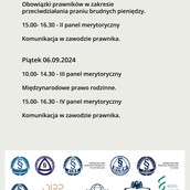 Od: 5 września 2024 Do: 7 września 2024 UL.PIASTOWSKA 14, OPOLE (SALA ORŁA BIAŁEGO), OPOLETematyka: Obowiązki prawników w zakresie przeciwdziałania praniu brudnych pieniędzy. Komunikacja w zawodzie prawnika. Międzynarodowe prawo rodzinne.