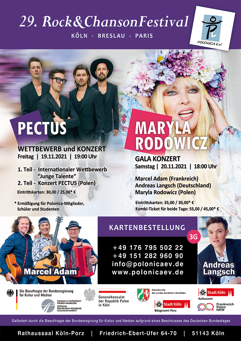Legenda polskiej sceny muzycznej - Maryla Rodowicz, zespół Pectus, Andreas Langsch oraz Marcel Adam gwiazdami 29. edycji Rock &Chanson Festiwalu w Kolonii w dniach 19.11.-20.11.2021