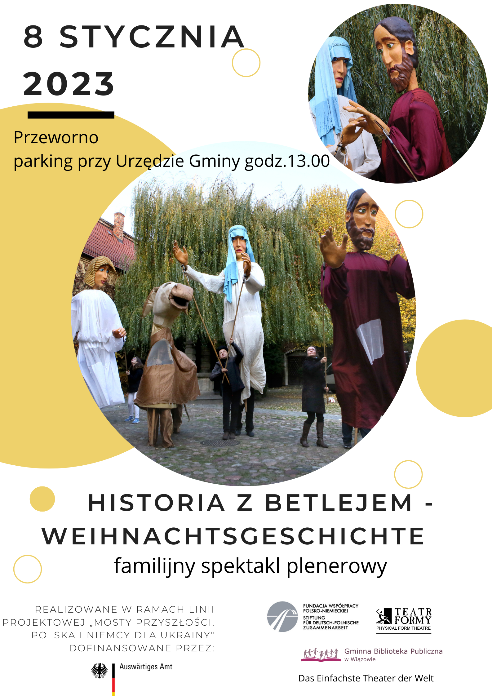okresie zimowym. Jest to spektakularna plenerowa forma Teatralna z udziałem 3.5 metrowych lalek postaci Marii, Józefa, Anioła i osiołka. Spektakl przy użyciu m.in muzyki klezmerskiej. Scenografię tworzą zarówno lalki jak i duży żłóbek. Całość wieńczy widowiskowy finał z pokazem sztucznych ogni przy dźwiękach kolędy. Gigantyczne Lalki animowane są przez 11 aktorów, przemieszczających się z w obrębie placu gry w Centrum przestrzeni miejskiej. W spektaklu wezmą udział aktorzy z Polski, Niemiec, Ukrainy i Białorusi. Artyści z Ukrainy i Białorusi przebywają obecnie w Polsce jako uchodźcy wojenni. Projekt prezentowany będzie w 4 miastach Dolnego Śląska we współpracy z samorządowymi organizacjami Kultury. Spektakl niesie w sobie treści edukacyjne w ramach wspólnoty kulturowej wszystkich krajów uczestniczących w projekcie, oraz ważnej i kluczowej roli Kobiety (postać Marii w społeczeństwie obywatelskim. Dialogi po polsku użyte w spektaklu zostały nagrane przez zawodowych aktorów w studio i wyemitowane z off'u przy użyciu nagłośnienia.