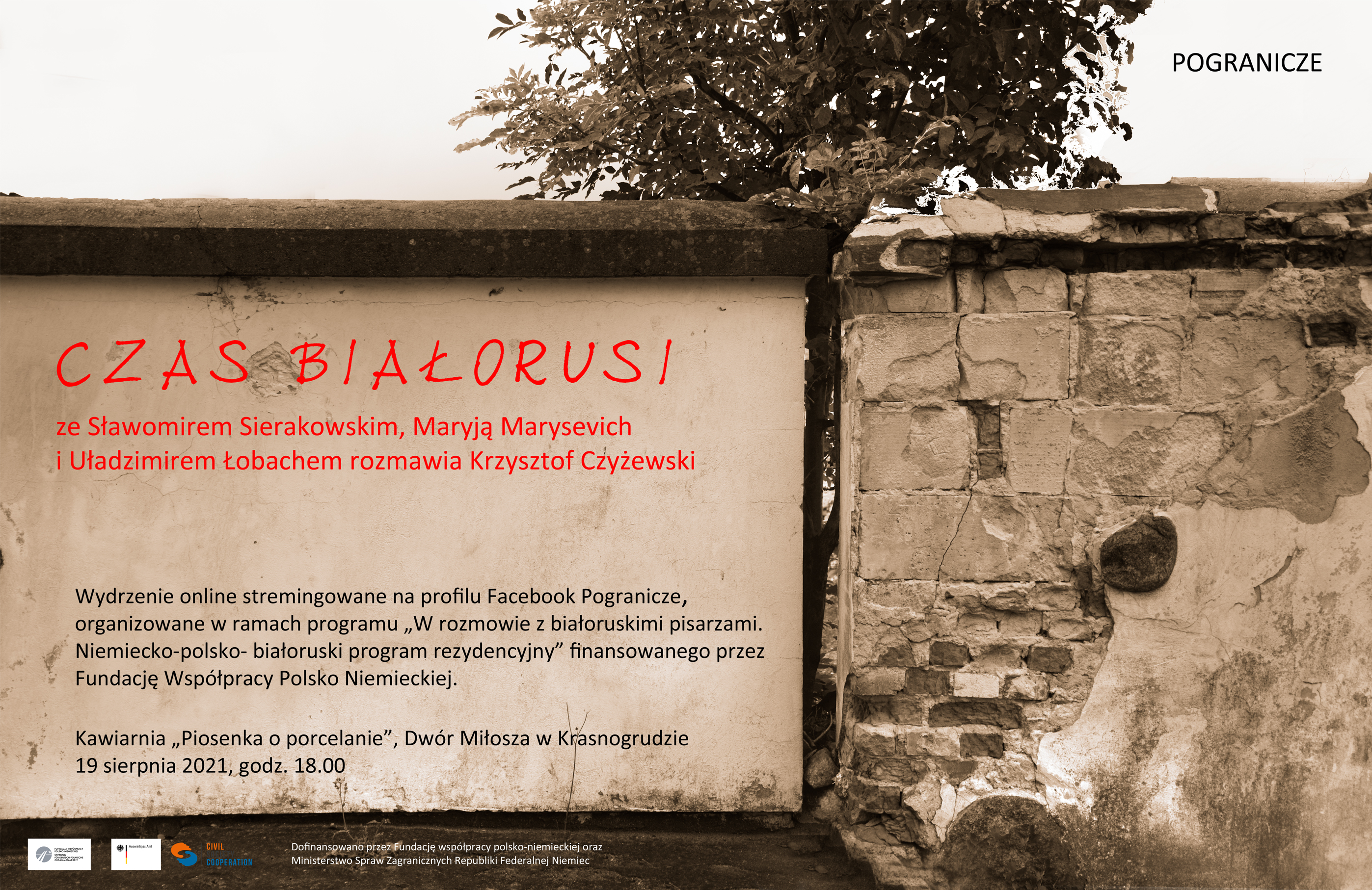 Zapraszamy serdecznie na debatę z udziałem Maryji Martysevič i Uladzimira Lobacha - białoruskich pisarzy, którzy przebywają obecnie na rezydencji w Międzynarodowym Centrum Dialogu w Krasnogrudzie. W ramach programu „W rozmowie z Białoruskimi pisarzami. Niemiecko-Białorusko-Polski program rezydencyjny”, który realizowany jest przez Fundację Pogranicze w partnerstwie z Fundacją Genshagen i finansowany ze środków Fundacji Współpracy Polsko-Niemieckiej, dwójka Białoruskich autorów zaproszona została najpierw na pobyt twórczy w Pałacu Genshagen w Niemczech. W ramach pobytu w Niemczech i w Polsce uczestnicy pracują twórczo, biorą udział w spotkaniach literackich i debatach. Otrzymają też jednorazowe stypendium.