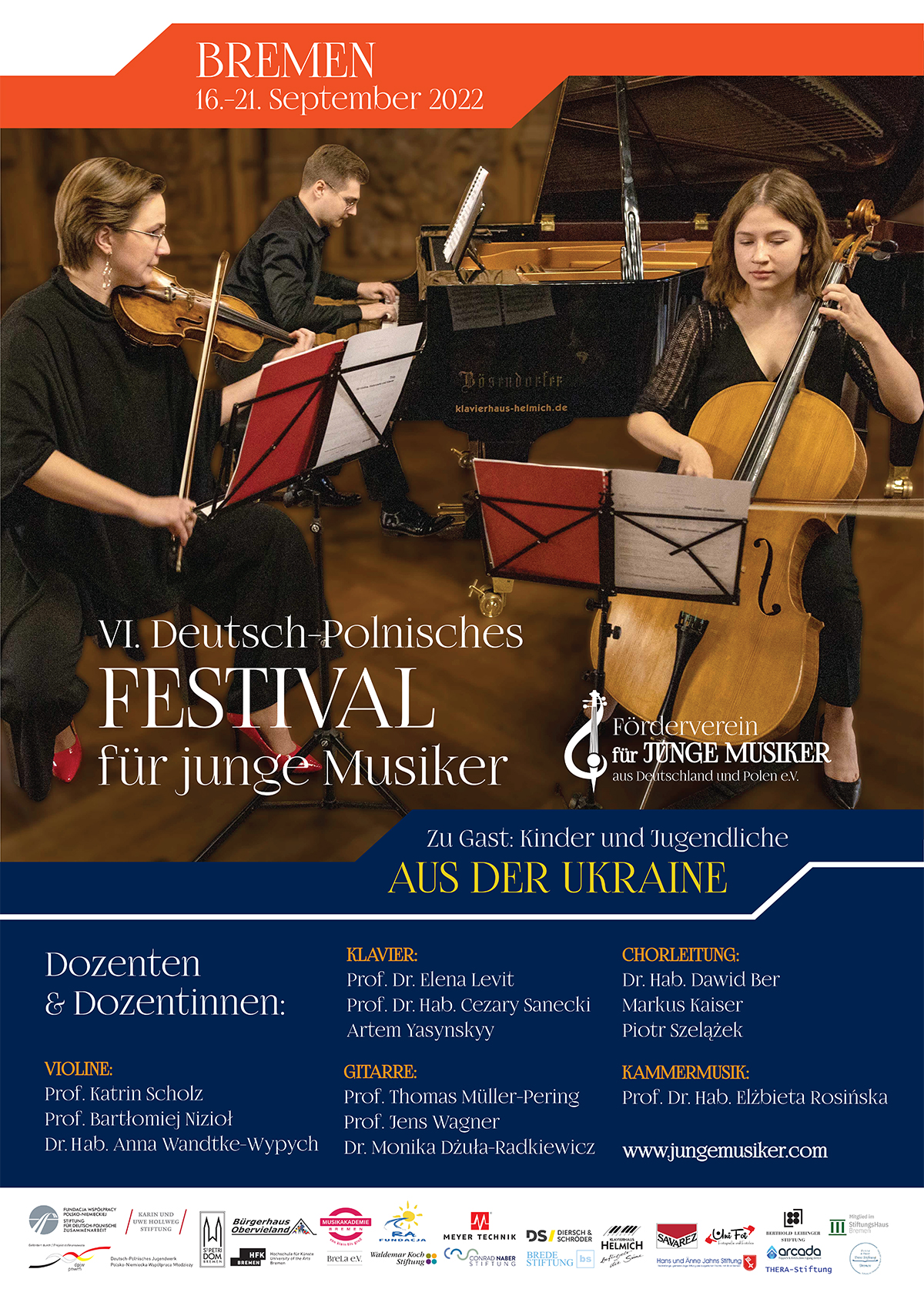 Das diesjährige VI. Deutsch-Polnischen Festival für junge Musiker, Bremen 2022, findet vom 16.-21. September statt, mit über 100 Teilnehmenden aus Deutschland und Polen sowie Gästen aus der Ukraine. Meisterkurse unter der Leitung 13 herausragender Musiklehrender in den Disziplinen Gitarre, Klavier, Violine, Chöre und Kammermusik an der Hochschule für Künste Bremen. Mit zwei unvergesslichen Konzerten im Bremer St. Petri Dom und dem Bürgerhaus Gemeinschaftszentrum Obervieland und einer inspirierenden, einzigartigen Besichtigung der Kunstgalerie Hollweg. Kulturelle Jugendbegegnungen sowohl während Freizeitaktivitäten und einer Museumsbesichtigung. Wir danken all unseren Partnern, dem St. Petri Dom, dem BGO und der HfK sowie all unseren treuen Förderern und Unterstützern.