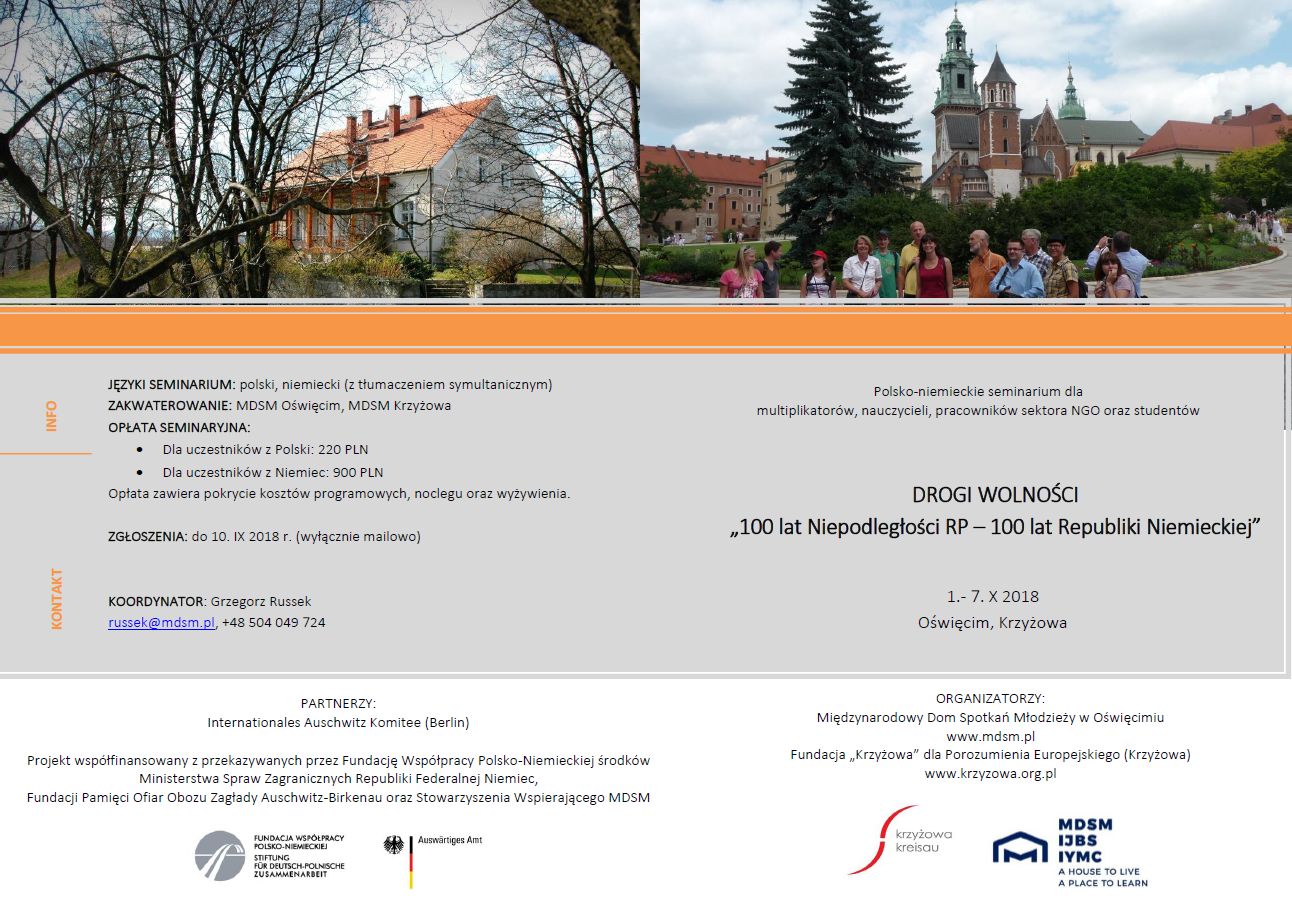 Tematem przewodnim tegorocznego siedmiodniowego polsko-niemieckiego seminarium w ramach cyklu "Drogi wolności" jest 100-lecie niepodległości RP i Re-publiki Weimarskiej oraz zjawisko pamięci. Dana kalendarzem rocznica, bezpośrednio dotycząca historii obu krajów, jest doskonałą cezurą by w jej świetle wspólnie zastanowić się na zjawiskiem pamięci oraz jej wpływem na kształtowa-nie przyszłości. Seminarium realizowany będzie w miejscach niezwykle ważnych zarówno dla historii obu krajów, jak również dla polsko-niemieckiego pojednania: w Oświęcimiu oraz w Krzyżowej. Tak podczas części seminaryjnej w obu ww. miejscach, jak i podczas wizyt studyjnych we Wrocławiu, Świdnicy, w Katowicach oraz w Krakowie, poruszane tematy oraz moderowane dyskusje dotyczyć będą wy-miany doświadczeń w kreowaniu i pielęgnowaniu pamięci o zdarzeniach sprzed 100 lat (i późniejszych) wraz z odniesieniem do czasu teraźniejszego i wyzwań przed nami stawianych w związku z nowo pojawiającymi się trendami i zjawiskami w polityce oraz życiu społecznym obu krajów oraz Europy. Nieodłącznym elementem projektu będzie próba skonfrontowania się z nauką płynącą z pamięci o wy-darzeniach z historii oraz zaaplikowaniem wniosków z niej płynących do realizacji potrzeb dnia dzisiejszego.