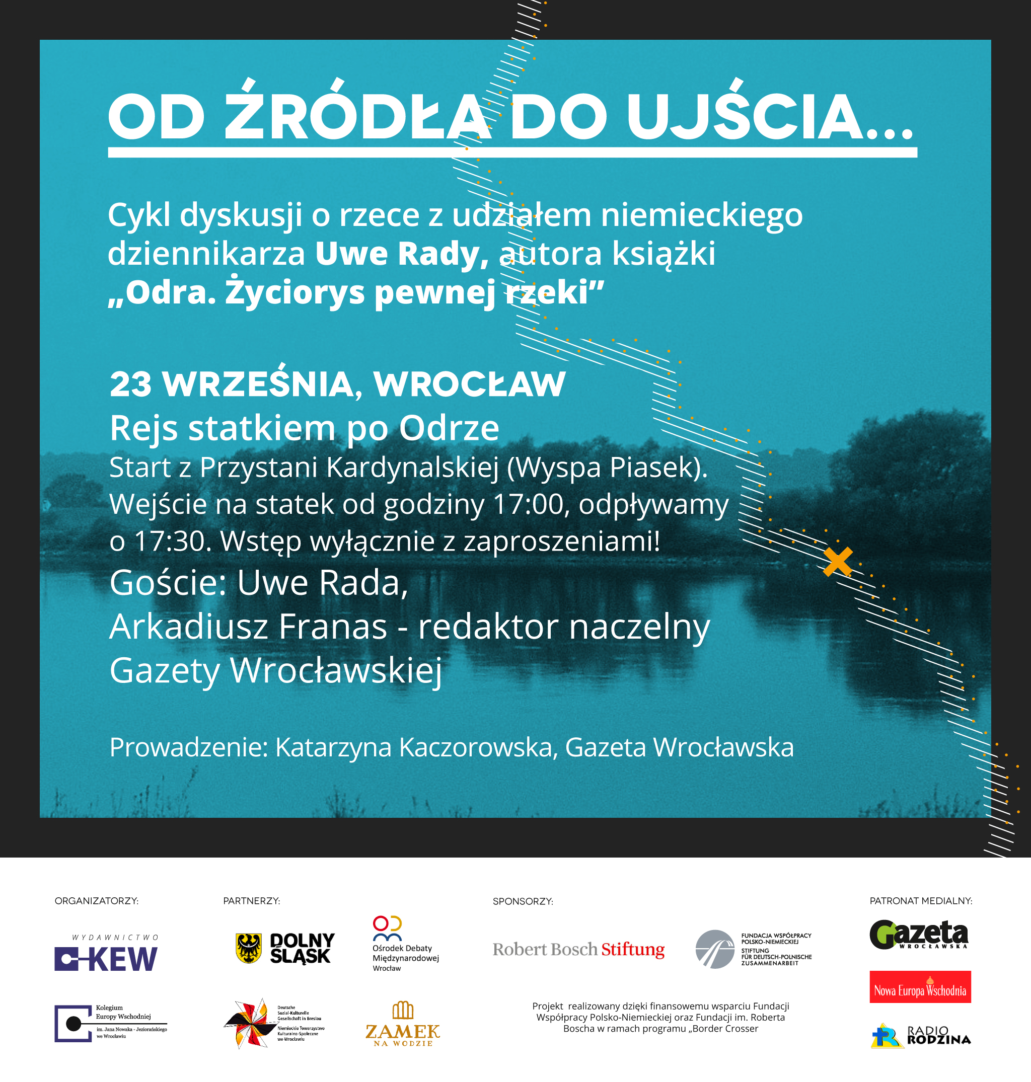 W ramach cyklu spotkań z udziałem autora książki „Odra. Życiorys pewnej rzeki” Uwe Rady zapraszamy na dyskusję, która odbędzie się na pokładzie statku. Gośćmi rejsu będą Uwe Rada oraz Arkadiusz Franas, redaktor naczelny Gazety Wrocławskiej. Spotkanie poprowadzi Katarzyna Kaczorowska z Gazety Wrocławskiej. Odpływamy w środę, 23 września, o godzinie 17:30 z Przystani Kardynalskiej na Wyspie Piasek, wejście na statek będzie możliwe od godziny 17:00. UWAGA: wstęp wyłącznie z zaproszeniami! Bezpłatne zaproszenia będą do wygrania w konkursach organizowanych przez Kolegium Europy Wschodniej, Wydawnictwo KEW oraz partnerów wydarzenia. Partnerzy: Urząd Marszałkowski Województwa Dolnośląskiego, Regionalny Ośrodek Debaty Międzynarodowej we Wrocławiu, Zamek na wodzie w Wojnowicach, Niemieckie Towarzystwo Kulturalno-Społeczne Patronat medialny: Gazeta Wrocławska, Radio Rodzina, Nowa Europa Wschodnia Projekt realizowany dzięki finansowemu wsparciu Fundacji Współpracy Polsko-Niemieckiej oraz Fundacji im. Roberta Boscha w ramach programu „Border Crosser”