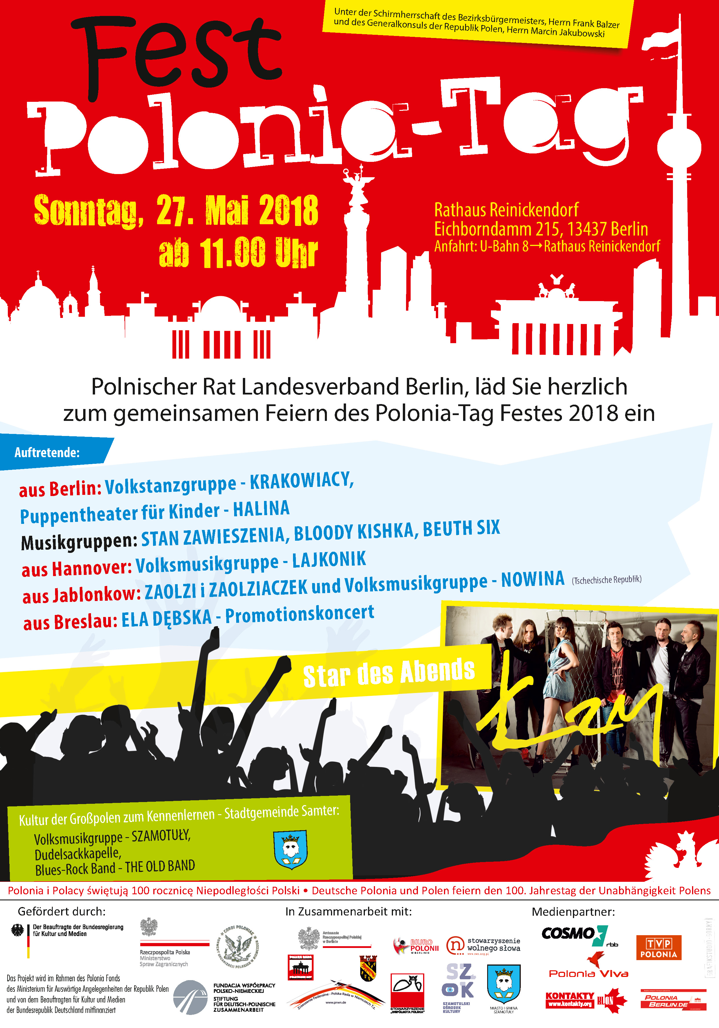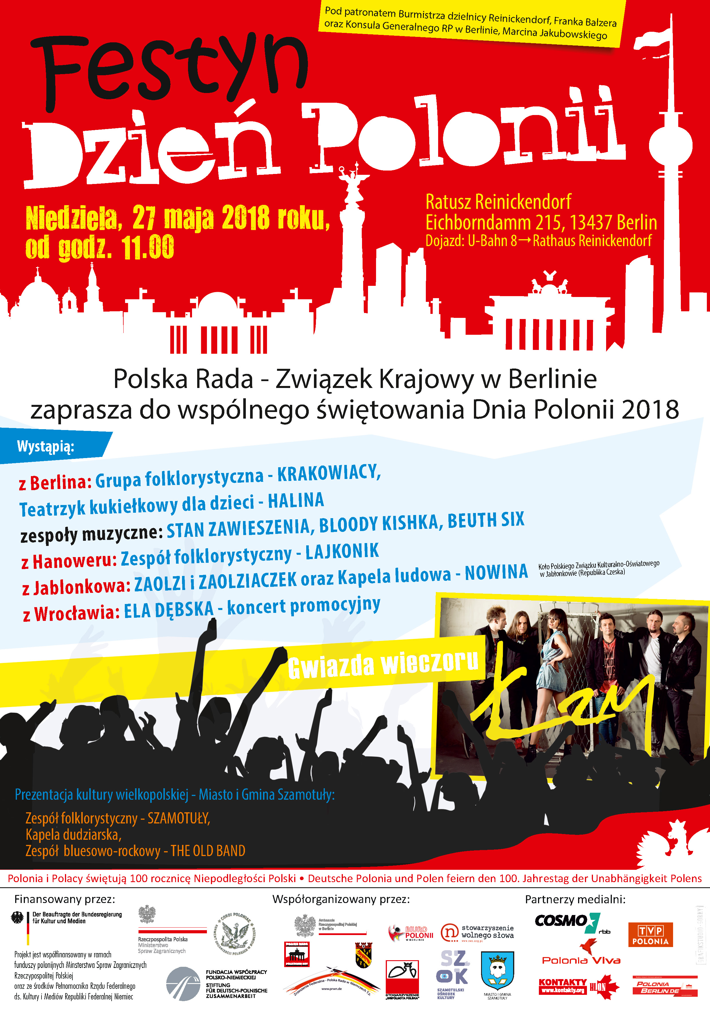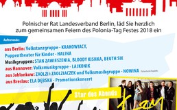 Po raz dziewiąty Zarząd Polskiej Rady Związku Krajowego w Berlinie wraz z Polakami i Polonia w Niemczech świętuje Dzień Polonii organizując festyn polonijny przed ratuszem dzielicy Reinickendorf.W ramach tego świeta pokazujemy piękno i wyjątkowość polskiej kultury i tradycji oraz atrakcyjność naszego Kraju jak również potencjał organizacyjny i kulturalny polonii Berlińskiej.Aby godnie uczcić rocznicę 100-lecia niepodleglości Polski zapraszamy na koncert pieśni narodowych i legionowych,wystawę okolicznościowa oraz występy tanecznych zespołów folklorystycznych z Berlina i Hannoveru, które zaprezentują polskie tańce narodowe.Bogactwo polskiego folkloru i jego autentyczność pokaże Zespół Folklorystyczny "Szamotuły",który wraz z twórcami ludowymi i kapelą Dudziarską udoskonali prezentacje gminy i miasta Szamotuły w Berlinie.Gościem specjalnym będzie zespół Łzy",którego wieczorny koncert poprzedzą występy berlińskich zespołów:"Stan Zawieszenia","Bloody Kishka","Beuth-Six" oraz Polaków z Zaolzia .Gościc będziemy Ele Dębska z Wrocławia ze swoim koncertem promocyjnym.Pod okiem animatorów kultury dzieci i młodzież będzie mogła wziać udział w różnego rodzaju aktywnościach w specjalnie zorganizowanej strefie zabaw.Niezwykle zrónicowana oferta kulinarna polonijnych resturatorów zaspokoi gusta dużych i malych uczestników imprezy.