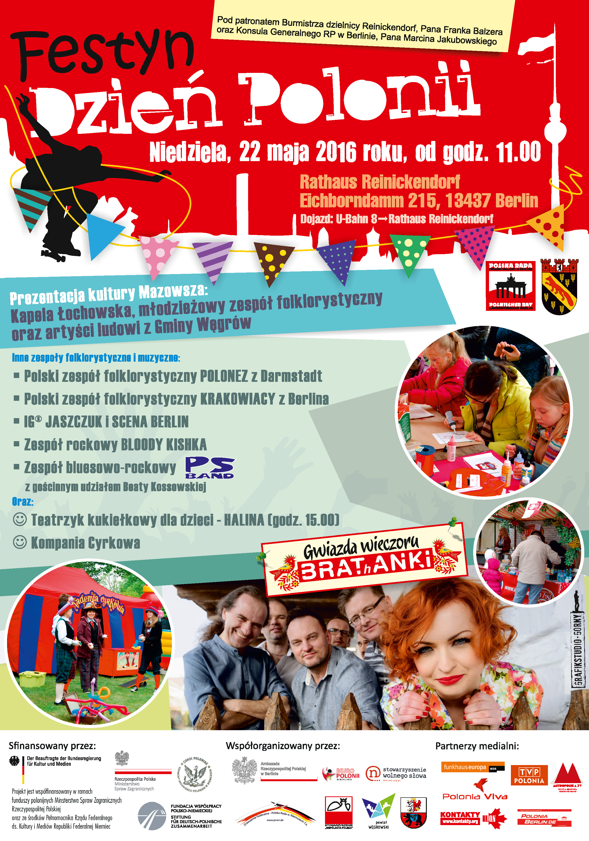 Dzień Polonii to impreza,która od czasu ustanowienia przez Sejm w Polsce w dniu 02.maja Dnia Polonii organizowana jest cyklicznie przez Polska Radę,Zwiazek Krajowy w Berlinie.Najważniejszym przesłaniem jest prezentacja dorobku polonijnych organizacji Berlina oraz kultury polskiej w Niemczech.Impreza realizowana jest w formie festynu ulicznego na placu przed Ratuszem dzielnicowym Reinickendorf.Jak co roku kultura polonijna zostanie zaprezentowana w formie wystepów berlińskich grup muzycznych,tanecznych,teatralnych zarówno amatorskich jak i profesjonalnych.Do udziału zostali zaproszeni także goście z Polski.W tym roku regionem,który będzie reprezentowal kulturę polskę będzie Mazowsze,Miasto i Gmina Węgrów.Festyn zakończy występ gwiazdy wieczoru czyli zespół BRATHANKI.Festyn swoim patronem objeli burmistrz dzielnicy ,Pan Frank Balzer oraz Konsul Generalny RP w Berlinie,Pan Marcin Jakubowski..