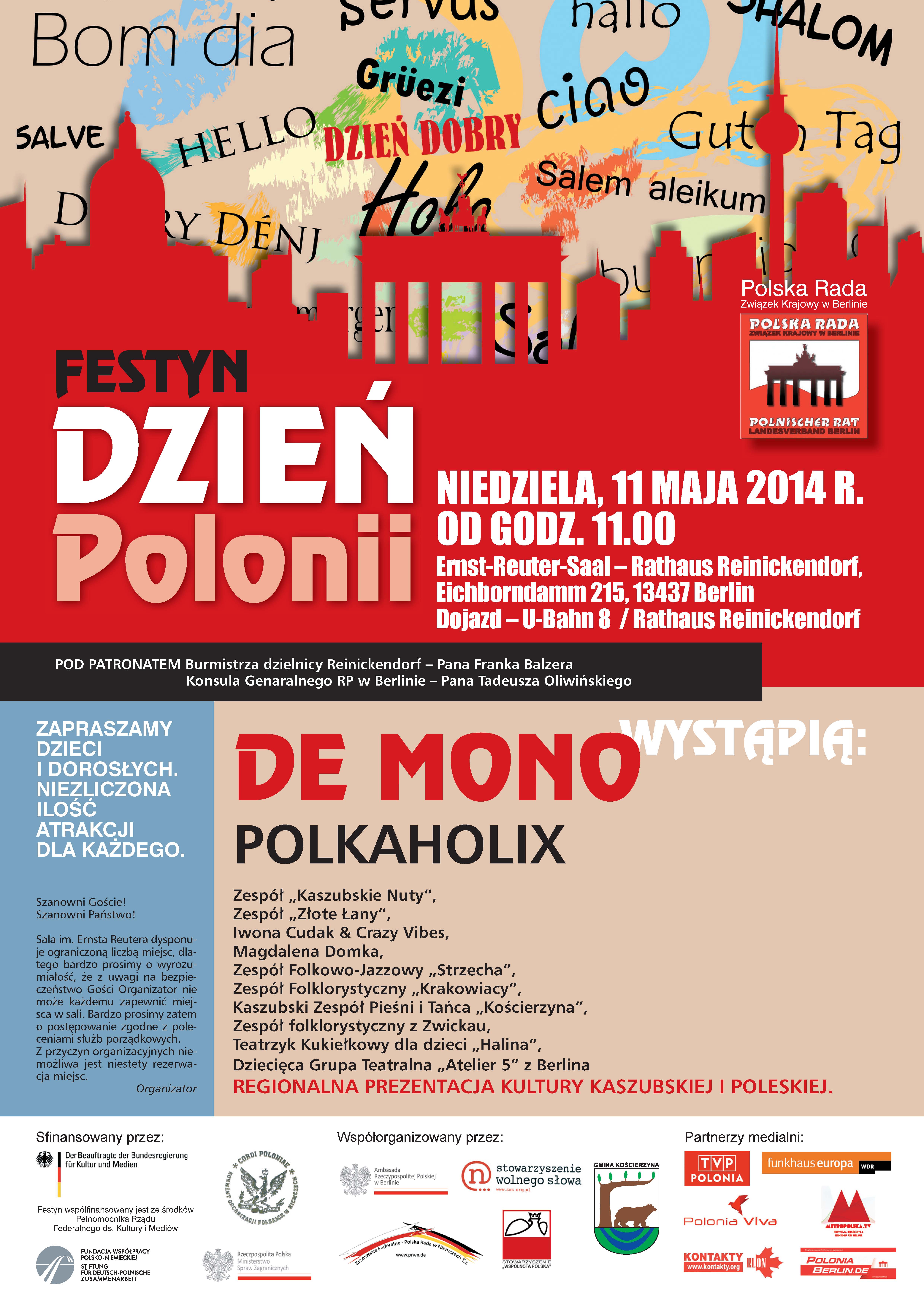Impreza adresowana jest w szczególności do Polonii z Berlina, Brandenburgii i Saksonii, ale również do mieszkańców województwa zachodniopomorskiego i lubuskiego. W tym roku gwiazdami festynu bedzie niemiecka formacja POLKAHOLIX ulubieniec berlinskiej publicznosci oraz kultowy zespol "De Mono", którego przeboje: „Kochać inaczej”, „Moje miasto nocą”, „Znów jesteć ze mną”, „Póki na to czas” czy „Statki na niebie” znane są wszystkim Polakom rozsianym po całym świecie. Nie zapomniano rowniez o najmlodszych, liczne zabawy na placu przed ratustzem, teatrzyk kukielkowy „Halina”, wystepy dzieciecej grupy teatralnej "Atelier 5", czy zespolu tanecznego "Krakowiacy" umilą pobyt naszym milusińskim. Nie zabraknie również przysmaków kuchni kaszubskiej, polskiej i kresowej. Zapraszamy całe rodziny w niedzielę 11-go maja od godz. 11-tej na festyn z okazji "Dnia Polonii" do berlińskiego Ratusza dzielnicy Renickendorf, Eichborndamm 215 – przystanek metra „Rathaus Reinickendorf” linii U 8.