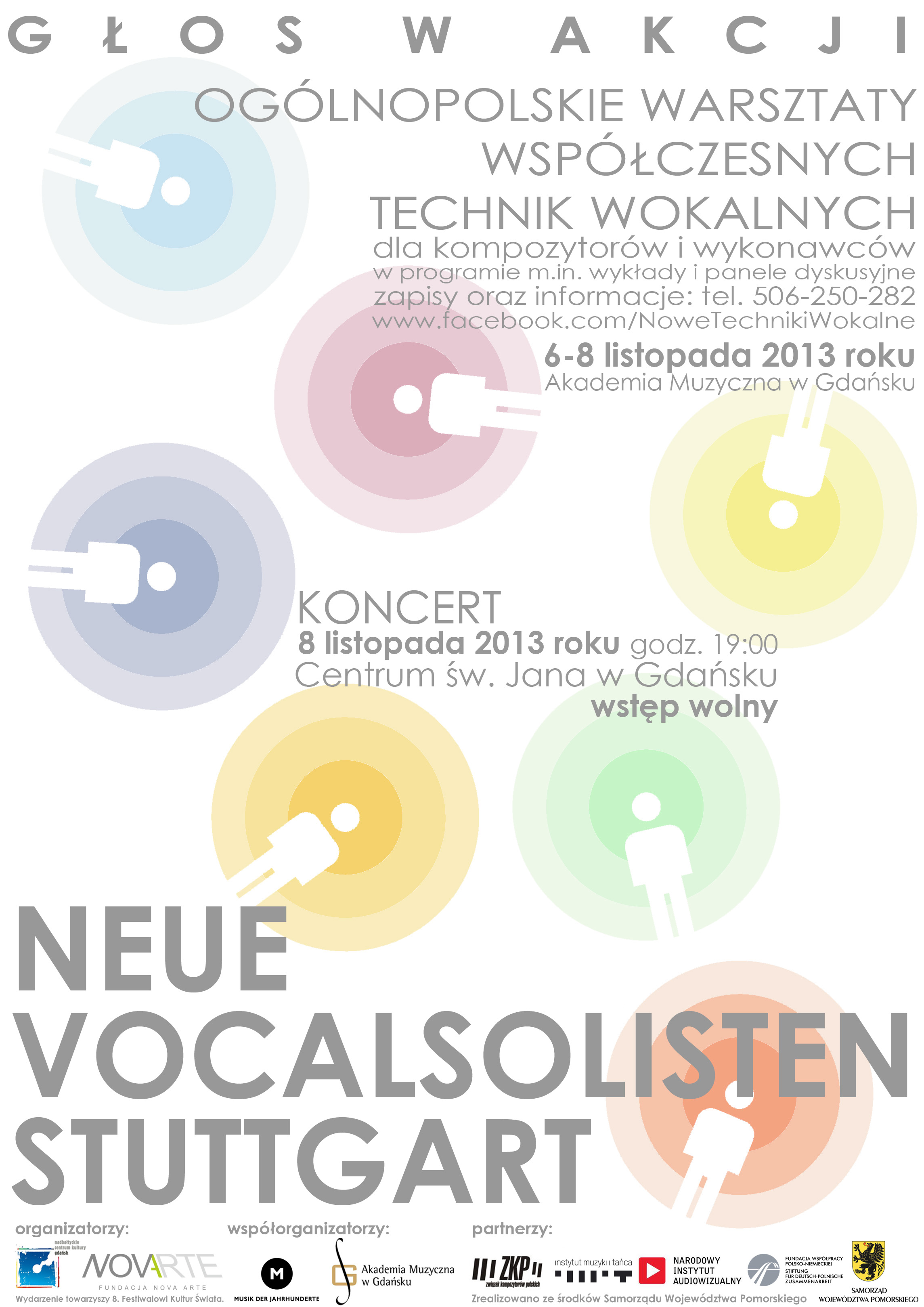 KONCERT Neue Vocalsolisten Stuttgart (Niemcy) 8 listopada godz. 19.00 | Centrum św. Jana , Gdańsk Neue Vocalsolisten Stuttgart działa od 1984 roku, specjalizując się w interpretacji współczesnej muzyki wokalnej. W skład zespołu wchodzi siedmiu solistów koncertowych i operowych, którzy badając właściwości dźwięku wciąż poszukują nowych technik wokalnych i nowych form artykulacji. Mówią o sobie: badacze, odkrywcy, podróżnicy i idealiści. Ich partnerami są profesjonalne zespoły i orkiestry radiowe, opery i wolna scena teatralna, elektroniczne studia i niezliczeni organizatorzy festiwali muzyki współczesnej i serii koncertów na całym świecie. Grupa wokalna zafascynowana muzyką basenu Morza Śródziemnego pragnie poświęcić rok 2013 twórcom z tego właśnie regionu, stworzyć, jak sama określa „współczesny dyskurs” zapraszając, do tworzenia dzieł, tak wybitnych twórców jak: Zeynep Gedizlioglu (Turcja/Niemcy), Zaid Jabri (Syria/Polska), Nimrod Katzir (Izrael), Zad Moultaka (Liban/Francja), Amr Okba (Egipt/Austria). Zamówione dzieła zostaną pokazane na wielu znaczących festiwalach na świecie, a jedno z nich – Utwór na 5 głosów |Zaida Jabri zabrzmi po raz pierwszy w wykonaniu Neue Vocalsolisten Stuttgart podczas Koncertu w dniu 8 listopada 2013 r. o godz. 19.00 w Centrum św. Jana w Gdańsku. W prawykonaniu dzieła Karola Nepelskiego Introduction to somatic singing zespołowi NVS towarzyszyć będą młodzi artyści z Chóru Kameralnego 441 Hz oraz wybrani uczestnicy warsztatów wokalnych. Koncert stanie się niewątpliwie spektakularnym wydarzeniem, któremu towarzyszyć będą prawykonania polskie i światowe.