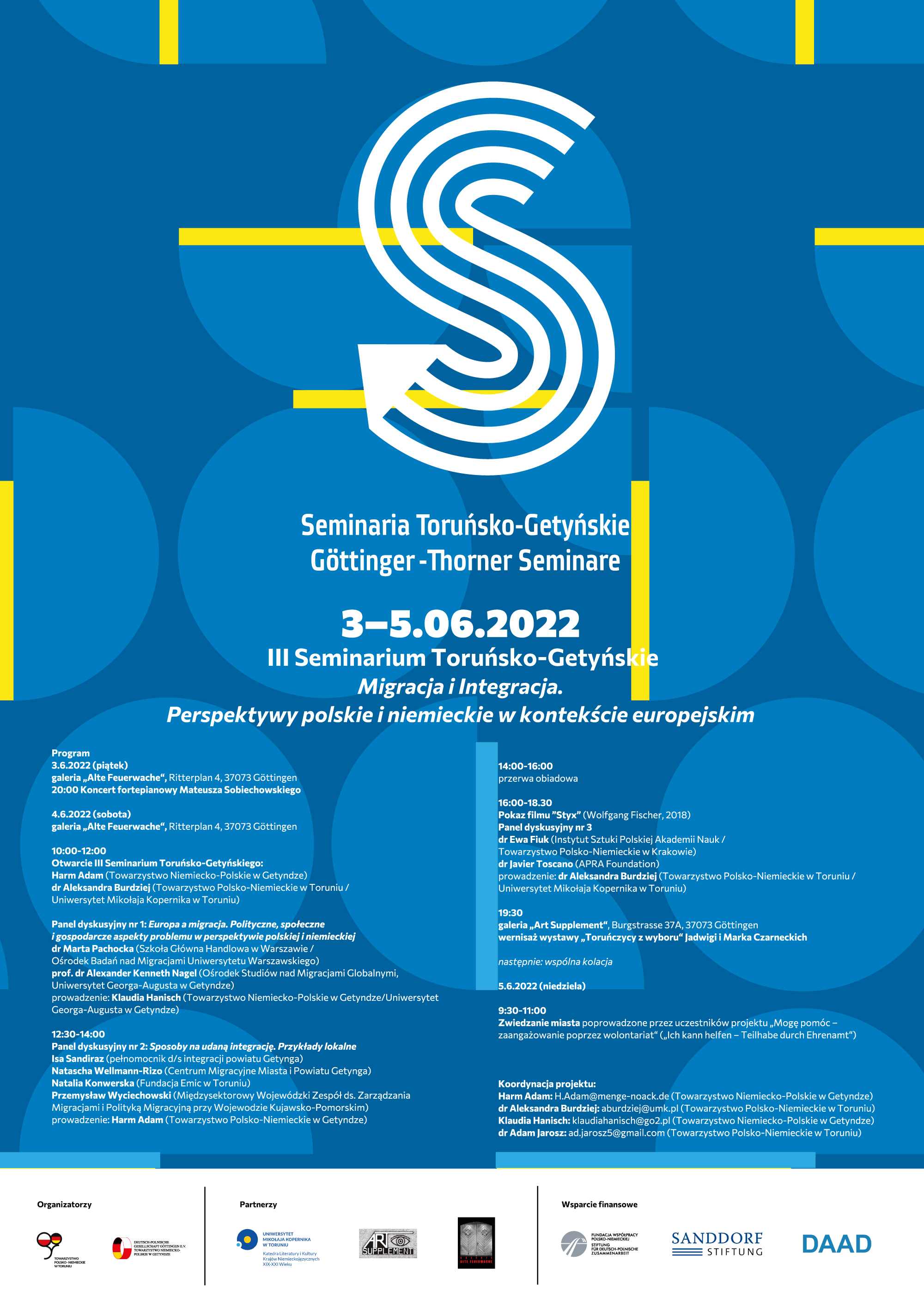 Temat Seminarium ma w tym roku stworzyć swobodną przestrzeń do rozmowy o złożonym i niezwykle dziś aktualnym problemie, jakim jest migracja i integracja. Od 2015 roku Europa mierzy się z kolejnymi falami migracji oraz kryzysami uchodźczymi. W roku 2022 w wyniku wojny na Ukrainie skala tego zjawiska osiągnęła niespotykane dotąd rozmiary. Dlatego chcemy wspólnie zastanowić się, w jaki sposób kwestie migracji oraz integracji postrzegane są przez Polaków i Niemców. W naszych dyskusjach uwzględnimy doświadczenia i punkty widzenia różnych kręgów społecznych – polskich i niemieckich ekspertów, ale i przedstawicieli lokalnych administracji, społeczeństwa obywatelskiego czy reprezentantów wspólnot migracyjnych. Na przykładzie filmu „Styx” (W. Fischer, 2018) przyjrzymy się ponadto, w jaki sposób do tematu migracji odnosi się sztuka filmowa, a szczególnym impulsem do refleksji ma się w założeniu stać prezentacja wystawy fotografii „Toruńczycy z wyboru“ Jadwigi i Marka Czarneckich. Tegoroczne Seminarium rozpocznie się koncertem toruńskiego pianisty i kompozytora Mateusza Sobiechowskiego, a zakończy wspólnym zwiedzaniem Getyngi.