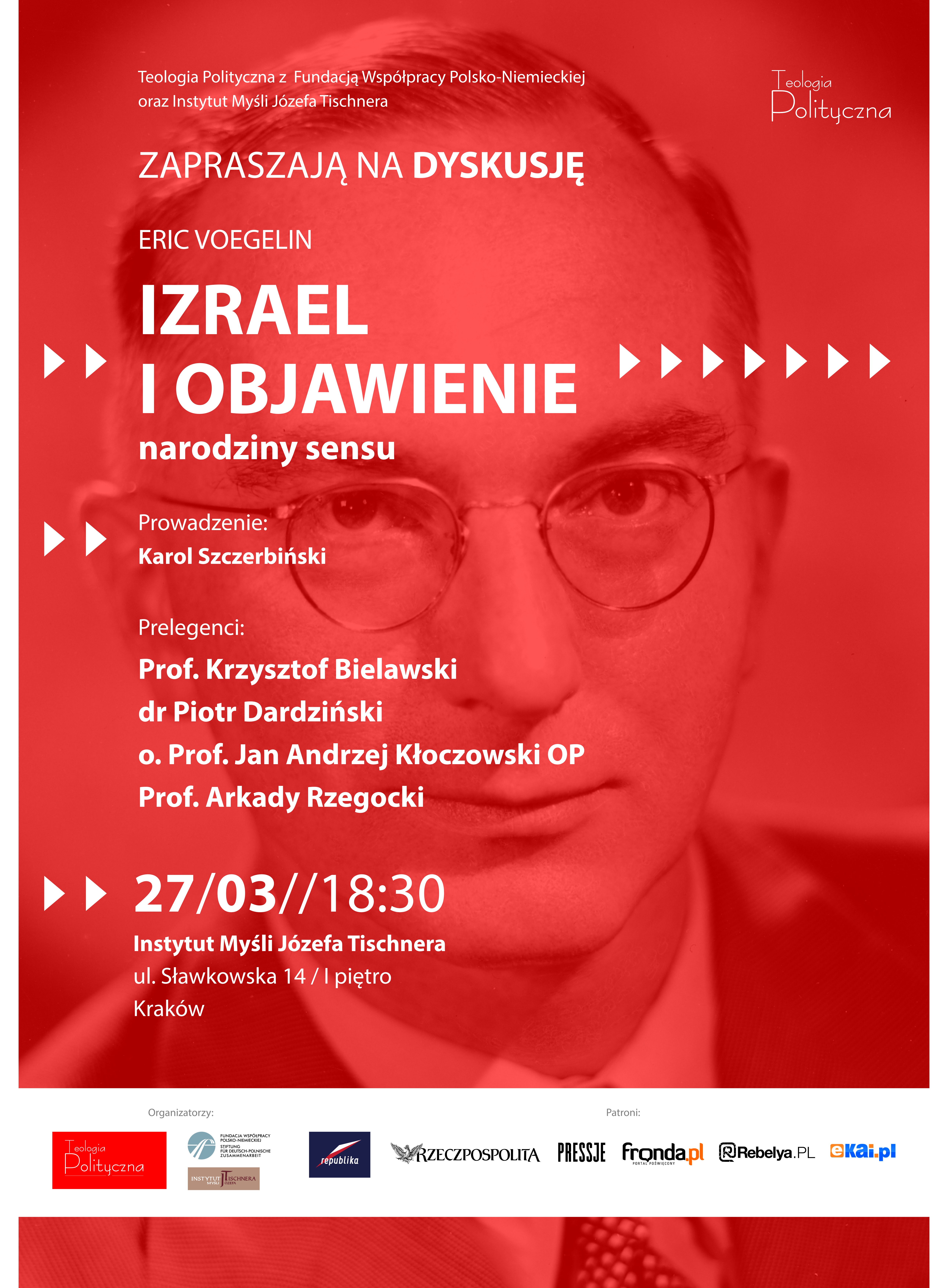 W dyskusji udział wezmą: Prof. Krzysztof Bielawski - filolog, wykładowca Uniwersytetu Jagiellońskiego, tłumacz, znawca patrologii, znawca teatru greckiego oraz religii greckiej, był współzałożycielem wydawnictwa Homini. Autor licznych książek i artykułów, a także redaktor naukowy wielu tytułów z zakresu historii i religii starożytnej. dr Piotr Dardziński - politolog, doktor nauk humanistycznych, wykładowca. Współtwórca Instytutu Tertio Millennio, którego był wieloletnim prezesem oraz byłby dyrektor warszawskiego Centrum Myśli Jana Pawła II. Był współtwórcą i wykładowcą w Wyższej Szkoły Europejskiej im. ks. Józefa Tischnera w Krakowie. o. Prof. Jan Maria Kłoczowski OP - dominikanin, kierownik Katedry Filozofii Religii przy Wydziale Filozofii Uniwersytetu Papieskiego Jana Pawła II w Krakowie, wykładowca Kolegium Filozoficzno-Teologicznego OO. Dominikanów w Krakowie. Pracuje nad zagadnieniami związanymi z filozoficzną refleksją nad religią: problem poznania religijnego, hermeneutyka doświadczenia religijnego, teologia negatywna, religia w kulturze post-sekularnej, współczesna antropologia a paideia. Mistrz Świętej Teologii. Prof. Arkady Rzegocki - politolog, pomysłodawca i kierownik projektu Polski Ośrodek Naukowy Uniwersytetu Jagiellońskiego w Londynie. Od 2011 roku kierownik studiów podyplomowych Polsko-brytyjskie partnerstwo strategiczne w UE i NATO. Visiting Scholar w Sidney Sussex College w Cambridge w 2014 roku. Od 2014 radny Miasta Krakowa, przewodniczący Komisji Innowacji Rady Miasta Krakowa Prowadzi: Karol Szczerbiński - Teologia Polityczna O książce: Historyczny porządek Izraela popada w kryzys zarówno na poziomie duchowym jak i pragmatycznym, kiedy zdano sobie sprawę, że w porządku zdominowanym przez Objawienie z Góry Synaj pominięto wymogi egzystencji w świecie. Wraz z ustanowieniem regularnej władzy królów, której nie gwarantuje słowo Boga z Synaju, w porządku Izraela dochodzi do nawrotu symbolizmu kosmologicznego. Ścieranie się tych dwóch doświadczeń porządku i ich symbolizmów ma miejsce przez większą część historii Izraela. Eric Voegelin O ile nie brakuje nam przekładów klasycznych prac dotyczących problemów współczesnych, o tyle klasyczne filozoficzno-polityczne prace dotyczące przeszłych okresów nierzadko wciąż nie są szerzej znane. Szczególnie odnosi się to do dziejów biblijnego Izraela, który bez wątpienia stanowi jedne z kluczowych filarów europejskiej kultury. prof. Paweł Śpiewak