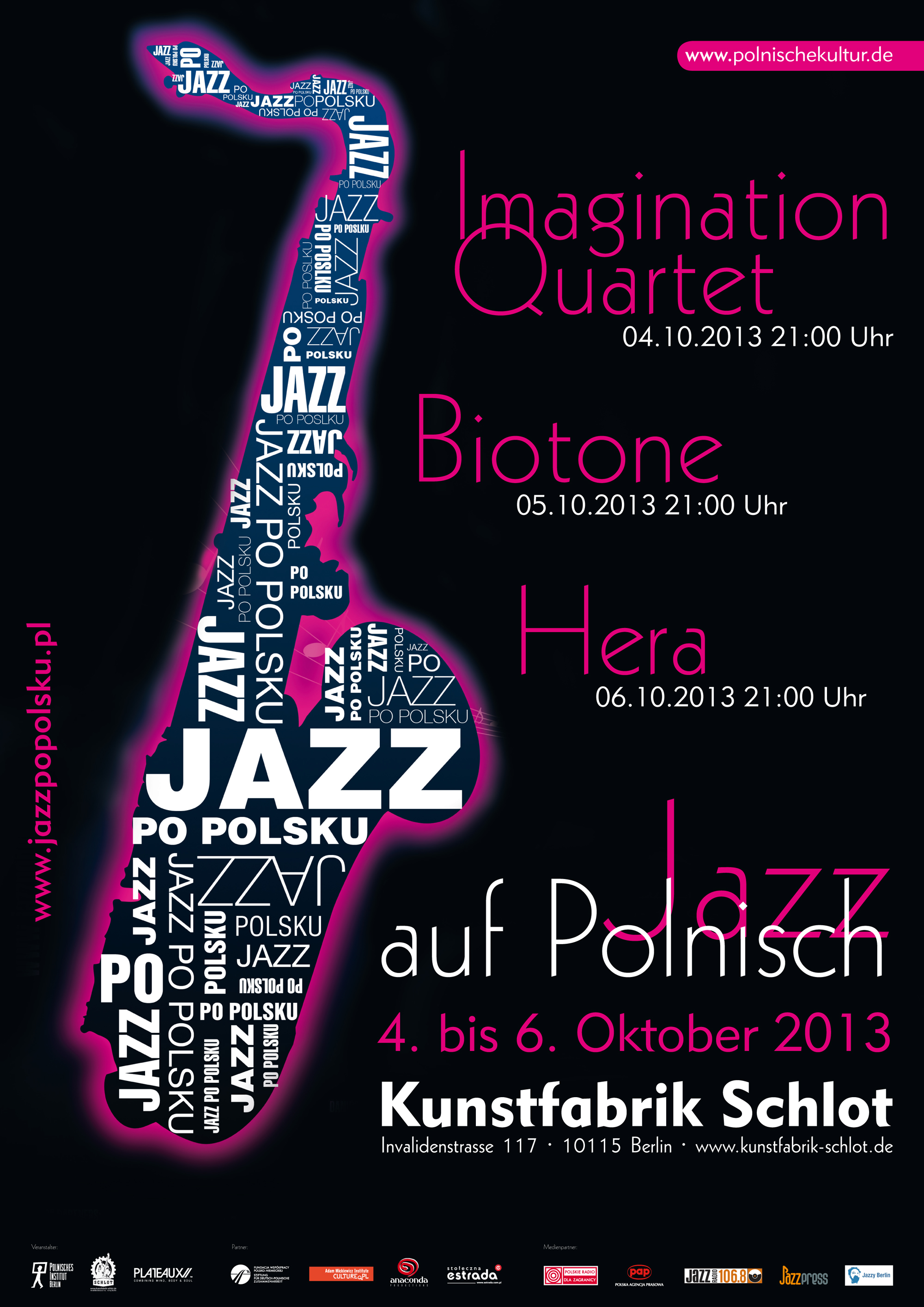 JAZZ PO POLSKU odbędzie się w dniach od 4 do 6 października 2013 r. w klubie Kunstfabrik Schlot w Berlinie. W ramach polskiego festiwalu jazzowego zagrają Imagination Quartet, Biotone i HERA. Wydarzenie organizowane jest we współpracy z Instytutem Polskim w Berlinie.