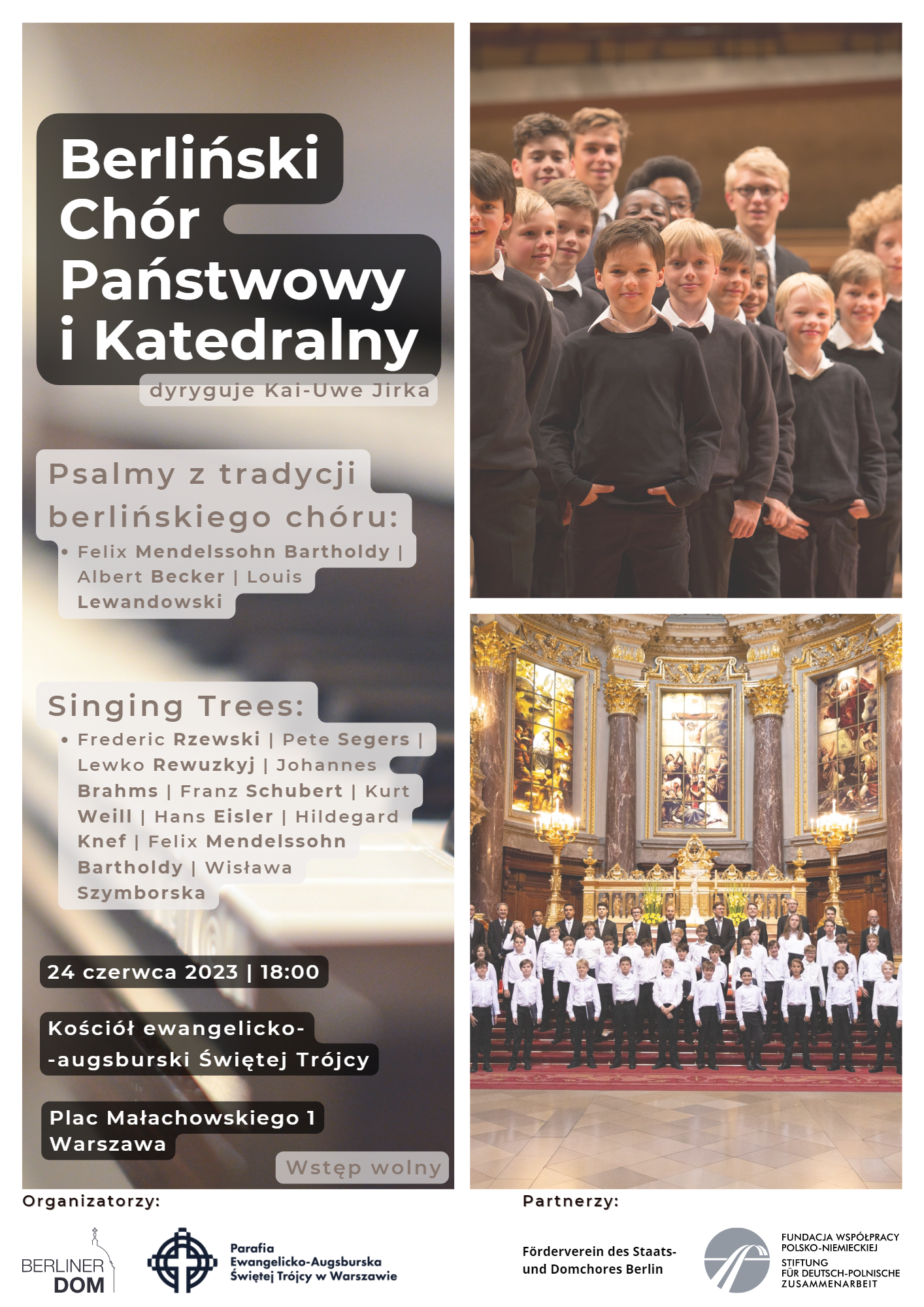 W ramach partnerskiej wizyty Berlińskiego Chóru Państwowego i Katedralnego (Staats- und Domchor Berlin) w Parafii Ewangelicko-Augsburskiej Świętej Trójcy w Warszawie będziemy mogli wysłuchać koncertu obejmującego dwie części: w pierwszej, zatytułowanej „Psalmy z tradycji berlińskiego chóru katedralnego” wykonane zostaną utwory kompozytorów związanych z berlińską świątynią: Felixa Mendelssohna Bartholdy’ego, Alberta Beckera i Louisa Lewandowskiego. Część drugą wypełni spektakl muzyczny zatytułowany „Singing Trees”, gdzie – obok muzyki Frederica Rzewskiego, Pete’a Segersa, Lewko Rewuckiego, Johannesa Brahmsa, Franza Schuberta czy Kurta Weilla – zaprezentowana zostanie poezja m.in. Wisławy Szymborskiej. W spektaklu dzieci i młodzież recytacją i śpiewem sprzeciwiać się będą wymieraniu drzew jako skutkowi postępujących zmian klimatycznych, wykonując utwory o drzewach i lasach z ostatnich 500 lat. Teksty niemieckie w polskim przekładzie Tomasza Ososińskiego będą recytowane przez młodych warszawskich aktorów. Kierownictwo artystyczne nad całością sprawować będzie prof. Kai-Uwe Jirka.