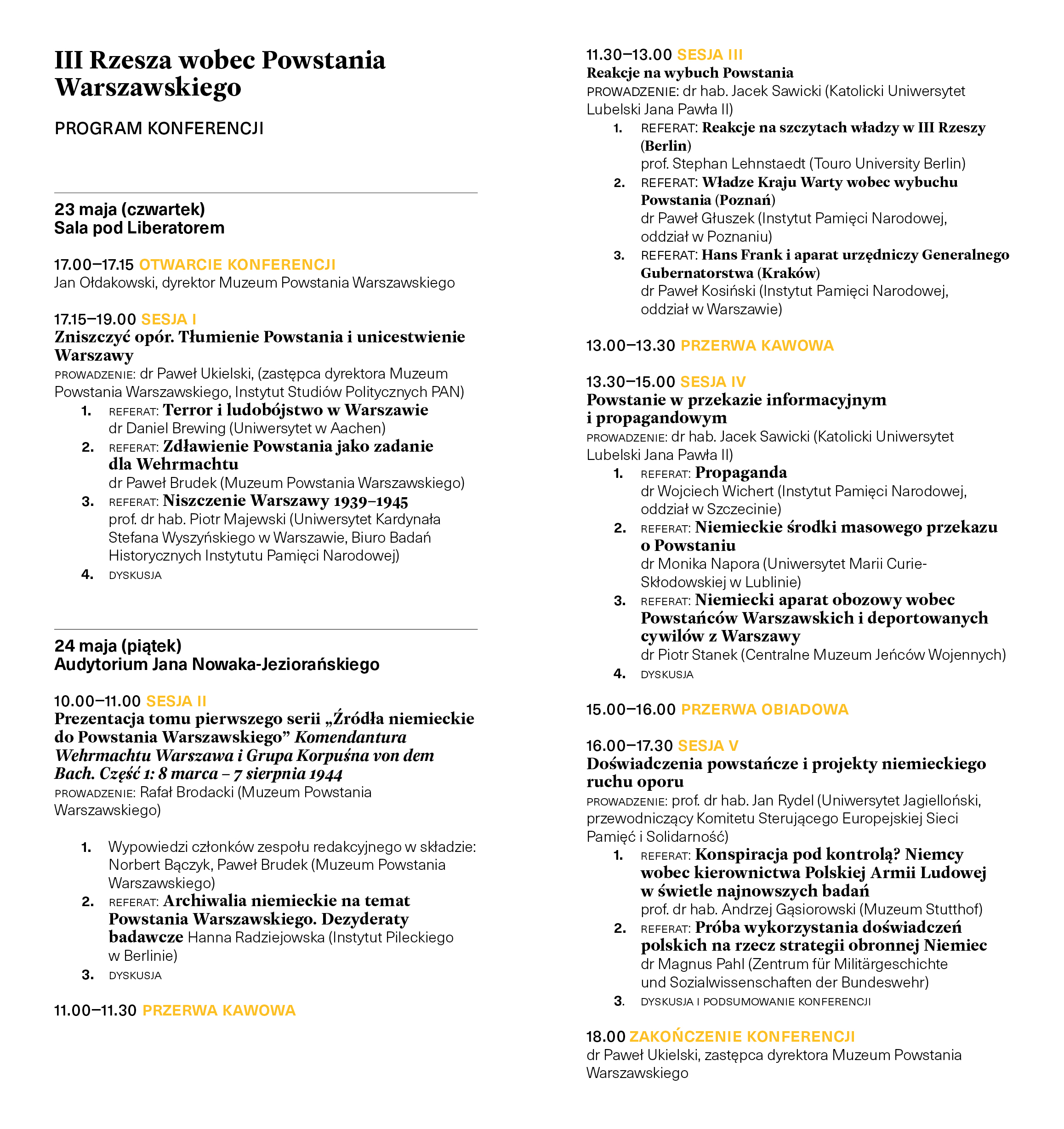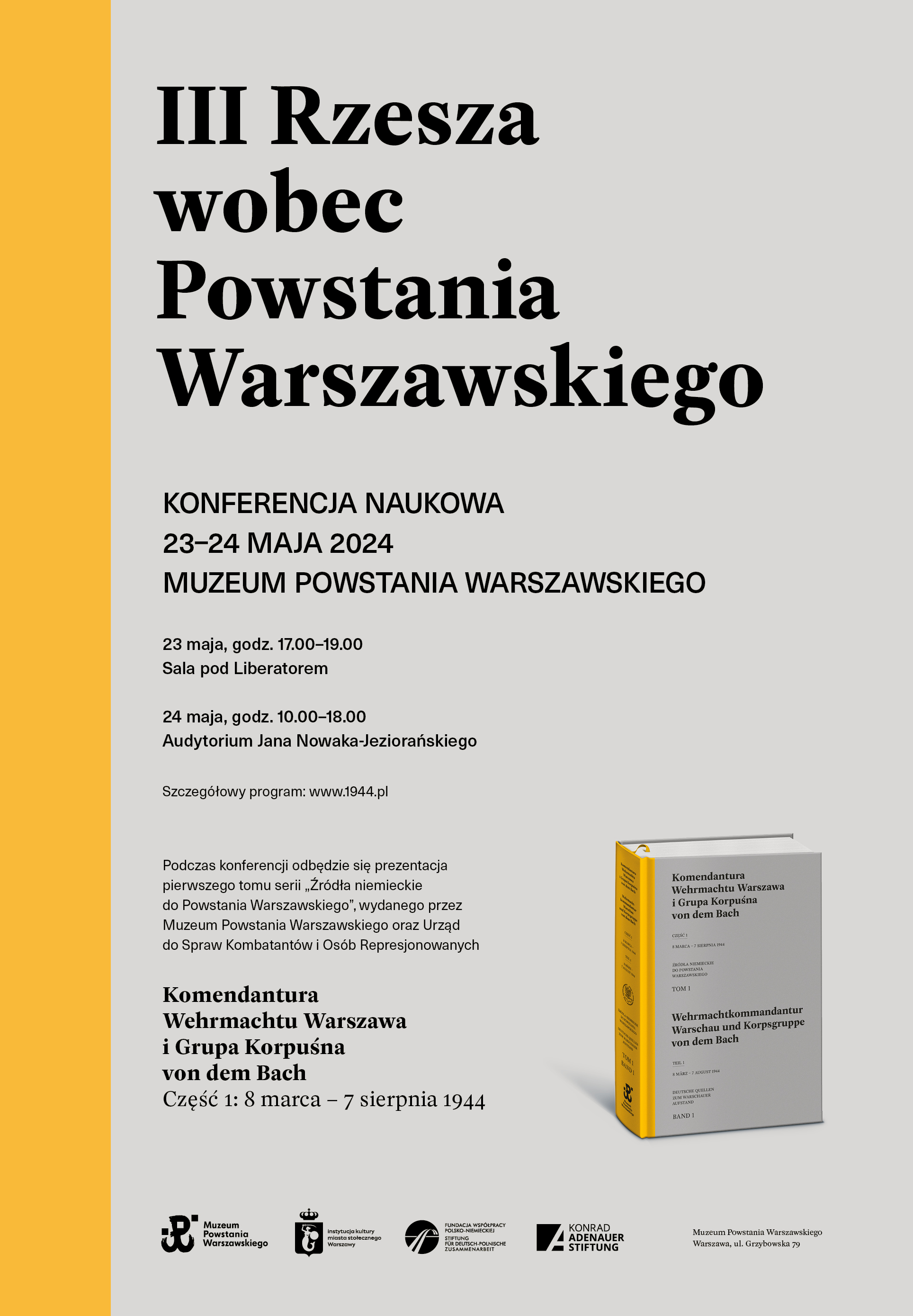 Polsko-niemiecka konferencja naukowa „III Rzesza wobec Powstania Warszawskiego” zorganizowana w roku 80-tej rocznicy tego wydarzenia ma za zadanie ukazać sierpniową insurekcję jako część niemieckiej historii II wojny światowej. Sesja będzie okazją do podsumowania stanu badań, ale i postawienia zasadniczych pytań dotyczących reakcji najwyższych władz III Rzeszy, wpływu Powstania na relacje pomiędzy najważniejszymi decydentami niemieckimi na Wschodzie, oraz prób wykorzystania polskiego zrywu na niwie propagandowej, politycznej i militarnej. Konferencji towarzyszyć będzie prezentacja pierwszego tomu źródeł niemieckich do historii Powstania Warszawskiego „Komendantura Wehrmachtu Warszawa i Grupa Korpuśna von dem Bach. Część 1: 8 marca – 7 sierpnia 1944 r.”, wydanego w bieżącym roku przez Muzeum Powstania Warszawskiego i Urząd do Spraw Kombatantów i Osób Represjonowanych, współfinansowanego przez Fundację Współpracy Polsko-Niemieckiej.