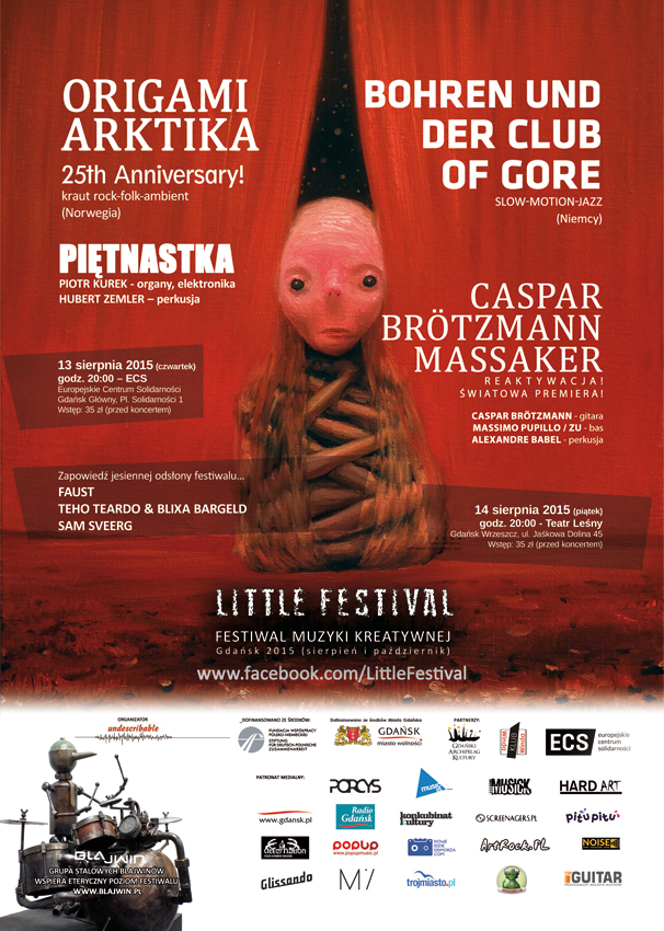 LITTLE FESTIVAL – festiwal muzyki kreatywnej - Gdańsk 2015 ORGANIZATOR: - undescribable DOFINANSOWANO ZE ŚRODKÓW: - Miasta Gdańska - Fundacji Współpracy Polsko-Niemieckiej PARTNERZY: - ECS-Europejskie Centrum Solidarności - Gdański Archipelag Kultury / Klub Winda PATRONAT MEDIALNY: - trojmiasto.pl, gdansk.pl, M/I kwartalnik muzyczny, Glissando, Noise Magazine, Hard Art, Top Guitar, Musick Magazine, musicis.pl, Porcys.com, ArtRock.pl, popupmusic.pl, Noweidzieodmorza.com, PituPitu.pl, screenagers.pl, AlterNation.pl, Konkubinat Kultury, Radio Gdańsk, Rock Serwis FM