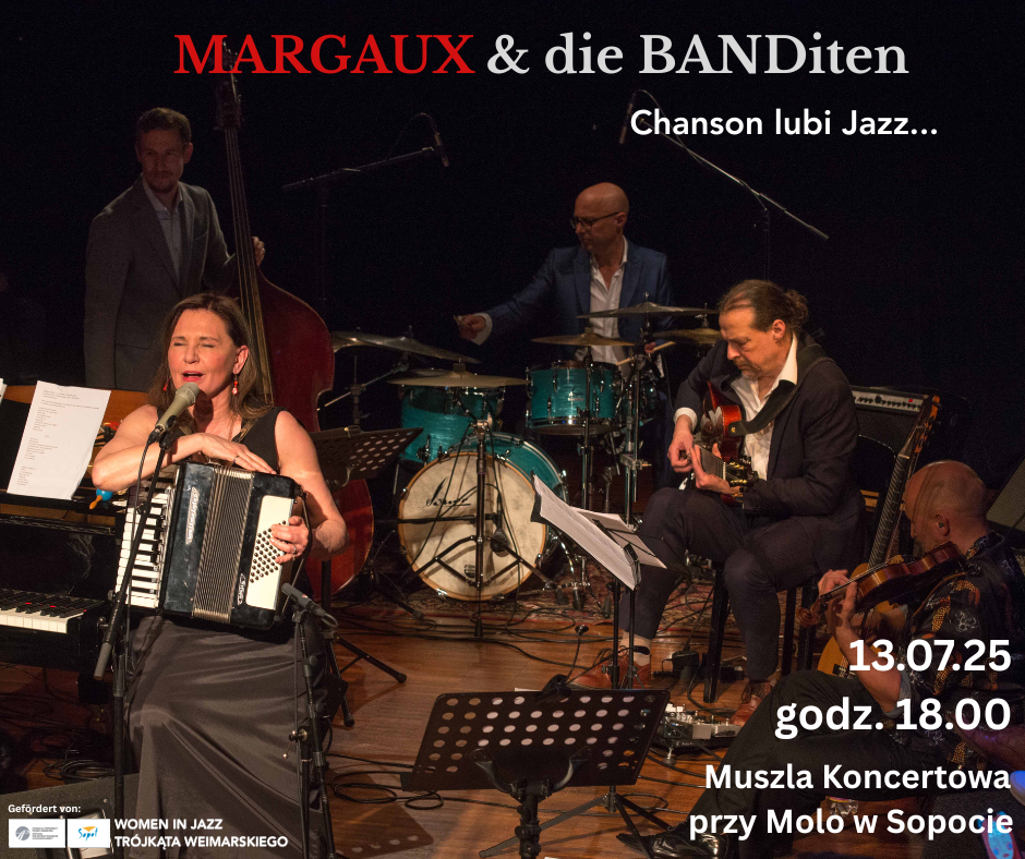 Margaux & die BANDiten „Chanson lubi Jazz“ Margaux & die BANDiten z Köln/Niemcy wypracowali własny, unikalny styl, przekraczając granice gatunków muzycznych i artystycznych. Ich twórczość to połączenie jazzu, chanson, worldmusic, teatru i literatury. Zespół działa od ponad 20 lat w międzynarodowym składzie – pochodzą z Niemiec, Czech, Holandii, Francji i Polski. Wielokrotnie występowali także na scenach w Polsce. Założycielką grupy jest Margaux Kier, która urodziła się w Bydgoszczy. W wieku 12 lat dołączyła do rodziców w Niemczech, mieszka w Kolonii. Doświadczenie emigracji miało ogromny wpływ na jej okrętną drogę artystyczną. Po studiach medycyny ukończyła wykształcenie jako aktorka i piosenkarka. Margaux & die BANDiten to jej projekt najbliższy sercu. Tu kreuje programy, tłumaczy poezję, pisze muzykę i teksty. Łącząc swobodę jazzowej improwizacji z aktorską charyzmą i subtelną narracją, potrafi w uniwersalny sposób przekazywać liryczne treści swoich piosenek - po tej i po tamtej stronie granicy – w międzyczasie aż w ośmiu językach. Teksty Margaux opowiadają o tęsknocie, miłości, przemijaniu – z liryzmem i humorem. Credo bandu to „Chanson lubi Jazz“ – znakomici BANDiten z lekkością balansują między stylami i tradycjami muzycznymi, celebrując jazzową wirtuozerię z nieustanną chęcią eksperymentowania. Wydarzenie Europolis Köln w Sopocie odbywa się pod patronatem Pani Cornelii Pieper, Konsul Generalny Niemiec a.d. oraz Pani Prezydent Miasta Sopot Magdaleny Czarzyńskiej-Jachim jako część projektu WOMEN IN JAZZ TRÓJKĄTA WEIMARSKIEGO i jest wspierany przez Fundację Współpracy Polsko-Niemieckiej i miasto Sopot. Koncert jest wynikiem muzycznej współpracy polsko-niemieckiej. Do zespołu z Kolonii dołączą znani muzycy z Trójmiasta: Marzena Sikała na skrzypcach oraz Maksymilian Kreft na perkusji. Występują: Henning Brand – dr, p Margaux Kier – voc, akk Stefan Rey - db Radek Stawarz – vl, va Frank Wingold – git Goście: Marzena Sikała - viol & Maksymilian Kreft – dr Wstęp wolny. Zapraszamy!