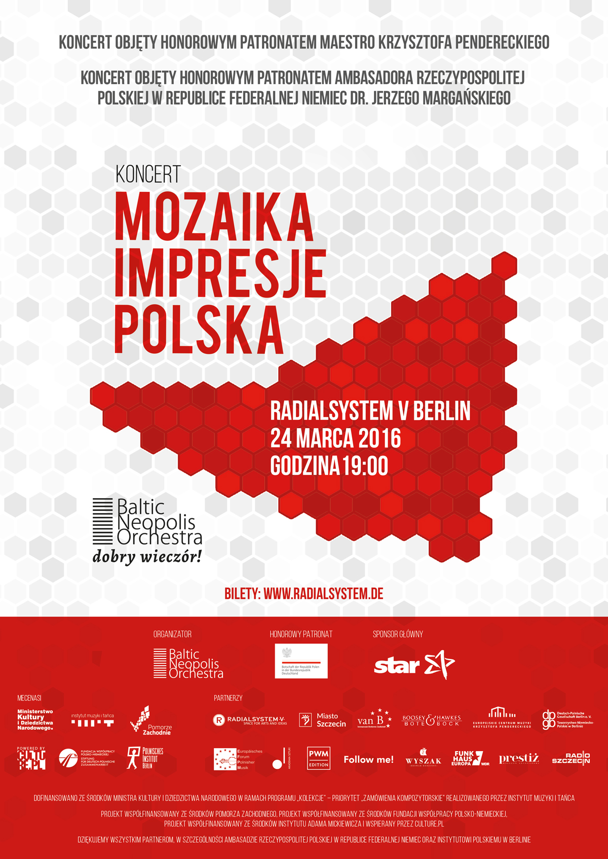 Wyjątkowy koncert MOZAIKA – Impresje – POLSKA pod honorowym patronatem maestro Krzysztofa Pendereckiego odbędzie się 24 marca 2016 roku w prestiżowym RADIALSYSTEM V w Berlinie z udziałem wybitnych artystów z Polski i Niemiec: Baltic Neopolis Orchestra, solistów Deutsche Oper, skrzypka Adama Bałdycha i jego zespołu oraz laureatów I Międzynarodowego Konkursu Kameralnego im. Ludwiga van Beethovena.