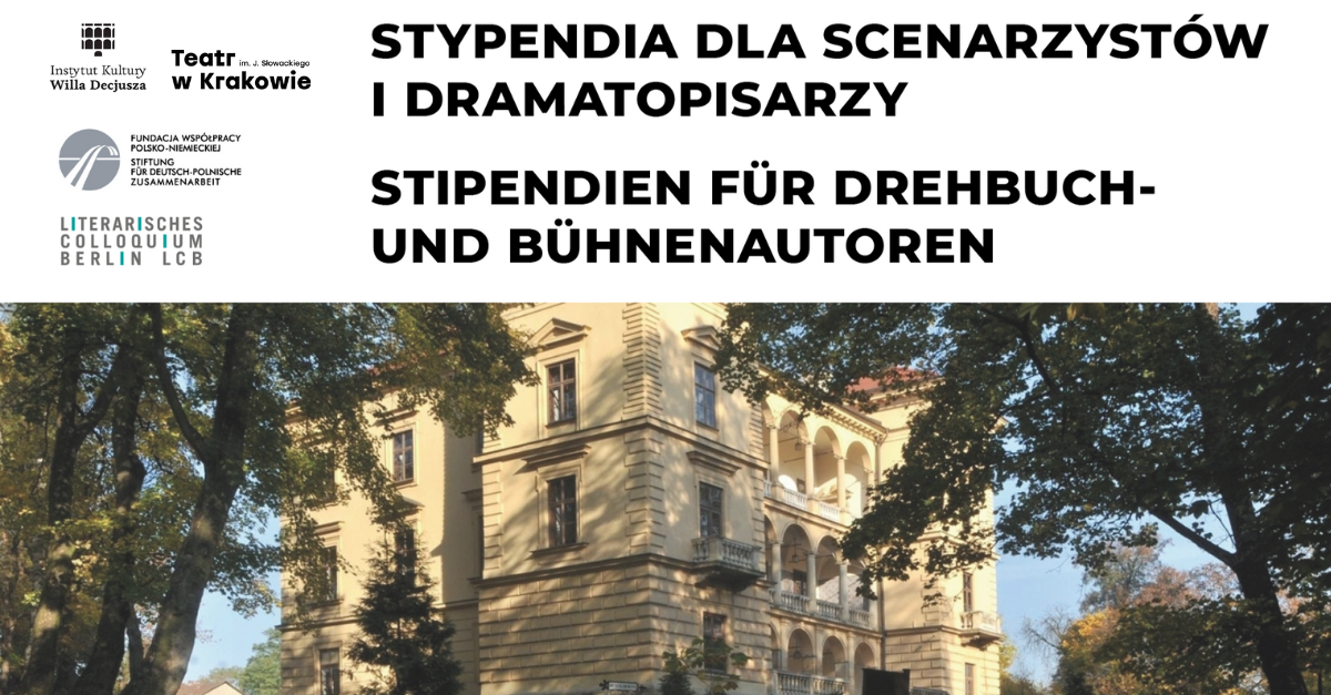 i niemieckich scenarzystów i scenarzystki, dramatopisarzy i dramatopisarki do składania aplikacji na jednomiesięczne stypendia w Willi Decjusza w Krakowie w jednym z trzech terminów: wrzesień, październik lub listopad 2023 roku. Termin nadsyłania zgłoszeń upływa 15 czerwca 2023 roku.