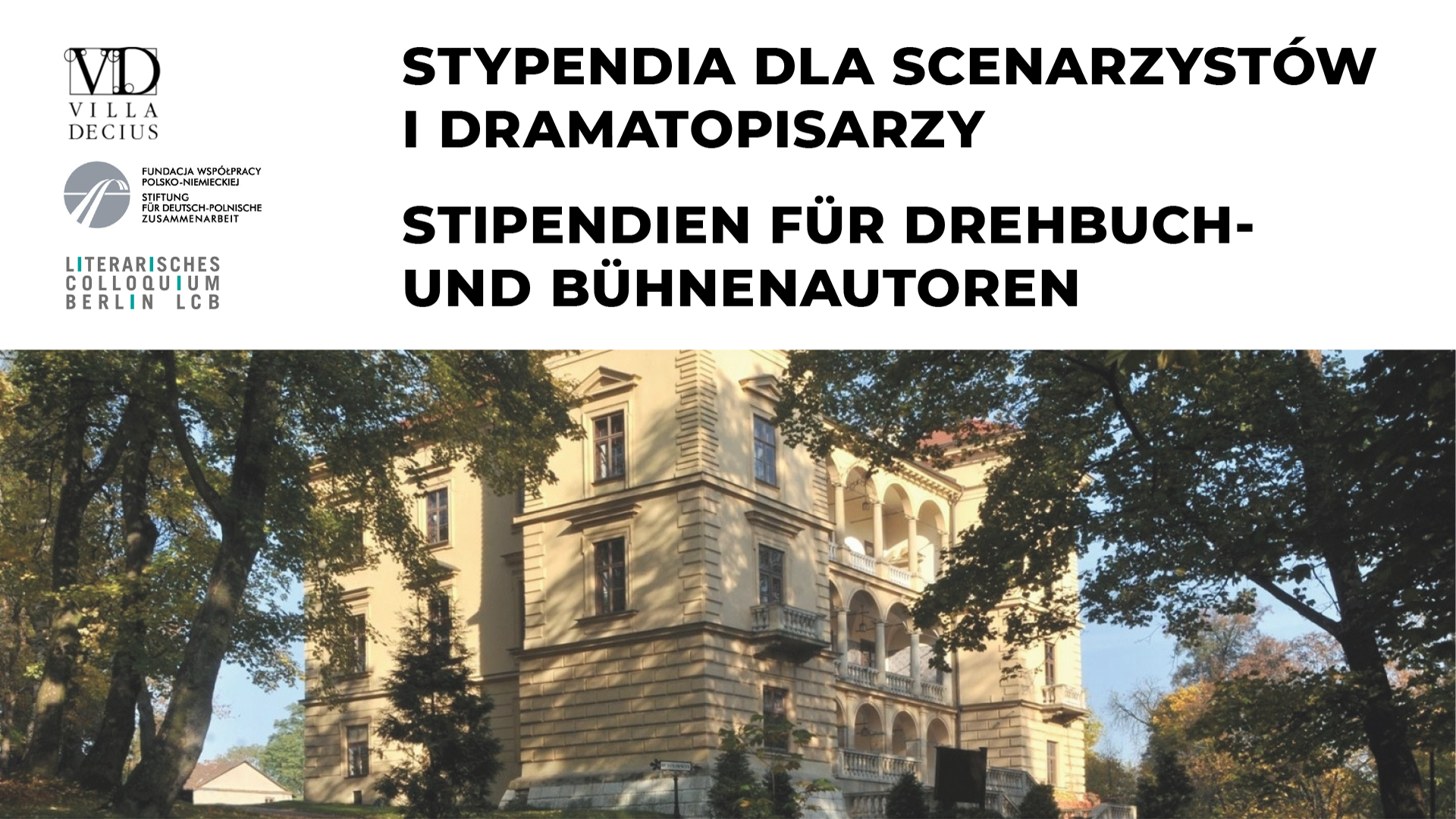 Stowarzyszenie Willa Decjusza i Fundacja Współpracy Polsko-Niemieckiej we współpracy z Literarisches Colloquium Berlin zapraszają polskich i niemieckich scenarzystów i dramatopisarzy do składania aplikacji na jednomiesięczne stypendia w Willi Decjusza w Krakowie w jednym z dwóch terminów: październik lub listopad 2022 roku. Termin nadsyłania zgłoszeń upływa 3 lipca 2022.