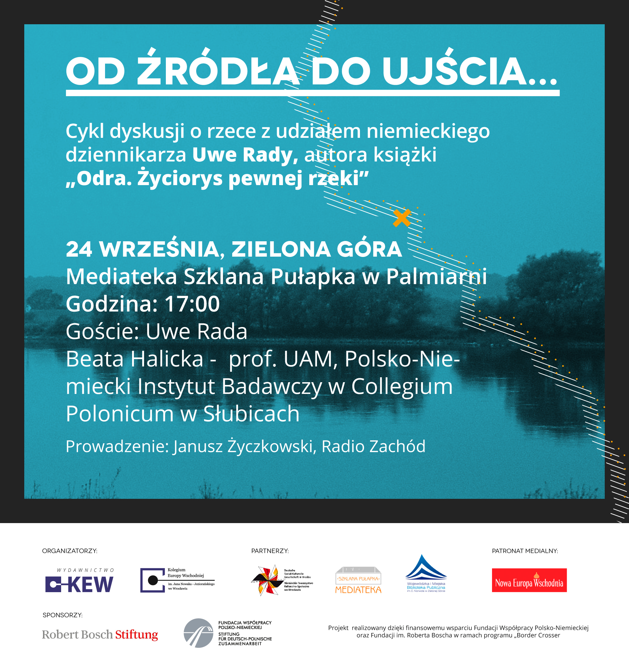 Kolegium Europy Wschodniej im. Jana Nowaka-Jeziorańskiego we Wrocławiu i Wydawnictwo KEW zapraszają na cykl spotkań poświęconych rzece z udziałem autora książki „Odra. Życiorys pewnej rzeki” Uwe Rady. W miastach położonych nad brzegami Odry chcielibyśmy zastanowić się wspólnie z dziennikarzami, przedstawicielami lokalnych instytucji kultury, naukowcami i mieszkańcami nad szansami i zagrożeniami, jakie niesie z sobą Odra. Dzięki projektowi chcielibyśmy także włączyć się w debatę na temat znaczenia rzeki we współczesnym pejzażu miasta. Przyczynkiem do dyskusji stanie się „Odra. Życiorys pewnej rzeki” Uwe Rady. W Zielonej Górze spotkamy się w Mediatece Szklana Pułapka w Palmiarni. Gościem spotkania, obok autora książki, będzie prof. Beata Halicka z Polsko-Niemieckiego Instytutu Badawczego w Collegium Polonicum w Słubicach. Spotkanie poprowadzi Janusz Życzkowski z Radia Zachód. Czy zatem „Odra” w ogóle istnieje? A może jest to jedynie konstrukt rzeki, której krajobraz jest bardziej sumą jej fragmentów niż spójną przestrzenią kulturową?- pyta Uwe Rada w swojej książce, a my chcielibyśmy zastanowić się razem z nim.