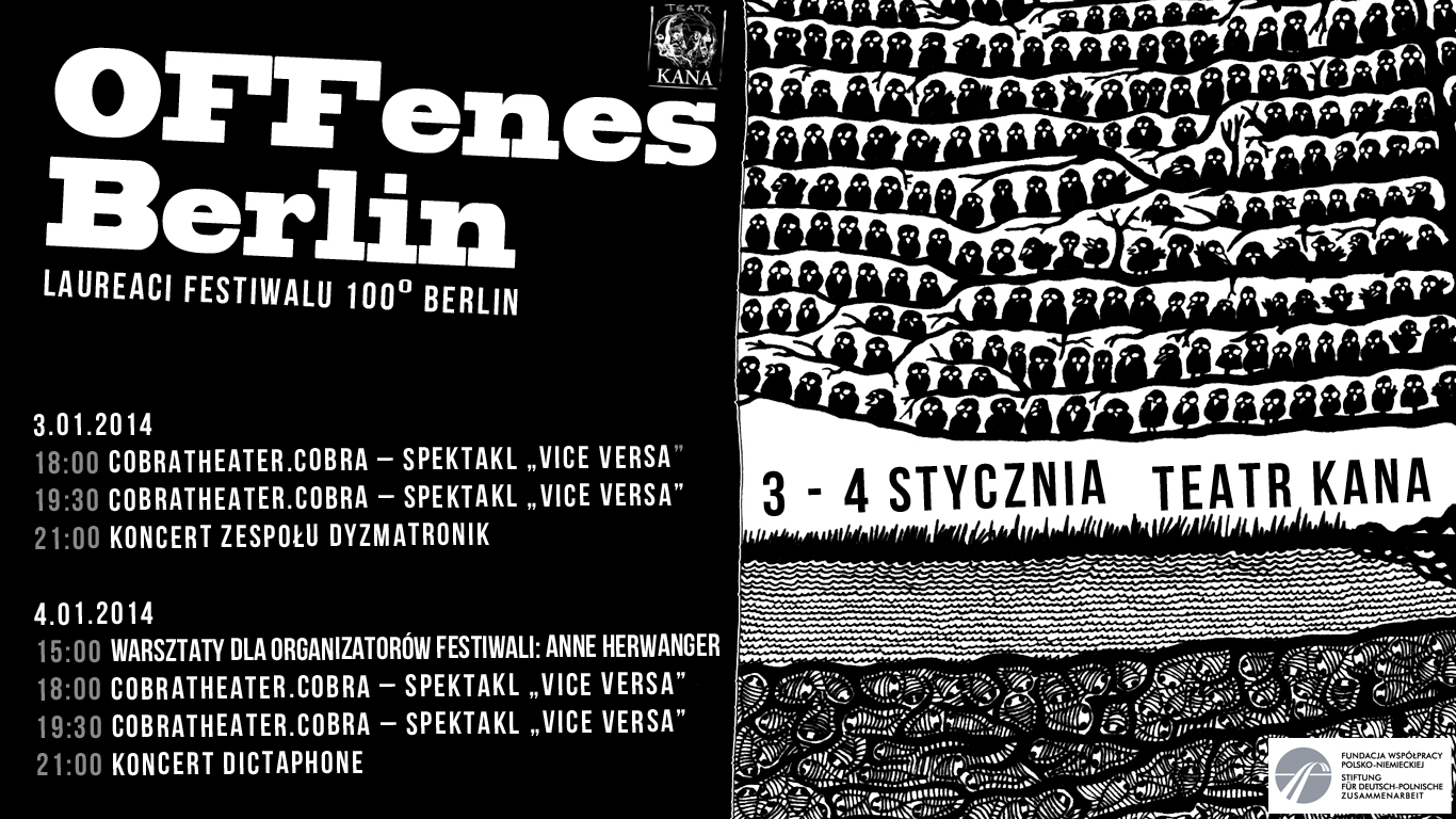 Zapisy na warsztaty: promocja@kana.art.pl Cobratheater.cobra – „VICE VERSA” Późnym latem 1939 r. Vsevolod Meyerhold został zaaresztowany przez służby bezpieczeństwa ZSRR. Do swojego przyjaciela Molotova napisał z więzienia: "Urzędnicy zaczęli używać przemocy przeciwko mnie, choremu, 65-letniemu człowiekowi." Zastanawiam się, jak sobie to wyobrazić. Widzę sprawnie zorganizowaną scenę z plutonem egzekucyjnym, jak na lekcjach historii, kiedy rozmawialiśmy na temat stalinowskich czasów. Widzę głupio-wierną twarz Sergeja Eisensteina, jak w tym samym roku (1939!) dla Stalina robi inscenizację "Walkirii" w Teatrze Bolszoj. To była karą od Stalina za to, że jego filmy przez lata więcej kosztowały, niż zarabiały. Boris Shumyatsky, producent Mosfilmu, został jednak zastrzelony. Co jeszcze widzę? Widzę brunatego niedźwiedzia, który przytłula gołego męższczyznę na plaży. Widzę kobietę, która wygląda jakby ONA była dzieckiem, z opakowania po czekoladzie. A poza tym widzę, jak leżę twarzą na podłodze, bo potknąłem się o kant dywanum kiedy przeszedłem przez drzwi. Jak chcemy współżyć? W jaki sposób mogę ci wytłumaczyć, że stałem się tym, kim jestem. Co się dzieje? Chcemy śledzić głębokie pytania ,kiedy będziemy w gościnie u Kany 3-go i 4-go stycznia. Przyjedziemy pociągiem regionalnym, wspólnie z całą kupą gastarbeiterów, którzy wracają na weekend do domu, do Kotliny Freienwaldzkiej, do ciszy pól listopadowych, do gęstwiny. Dawniej temu chętnie twierdziłem: "Moja chata stoi na uboczu wsi, ja o niczym nie wiem!" a teraz: "VICE VERSA! Cobratheater.cobra cobratheater.cobra to sieć założona w roku 2008 przez Juliane Hahn, Martina Grünheita i Wanję van Suntum w Hildesheim. Funkcjonuje też jako marka. Kto choć raz uczestniczył w projekcie pod jej egidą, może sygnować własne projekty jako cobra[...].cobra. W ramach sieci powstają spektakle, filmy krótkometrażowe, instalacje i sztuki wideo. Metody pracy i estetyki, którymi posługują się poszczególne ugrupowania pod egidą cobratheater.cobra, świadomie nie zostały ustalone i nie są jednoznaczne. Powstaje teatr, łączący wielogłosowość i polemikę. Każda realizacja w sieci cobra poddaje się krytyce pozostałych członków, którą to krytykę upowszechnia się w ramach danych spektakli. Może być rozdawana publiczności w formie tekstu albo pojawiać się jako wydarzenie sceniczne. W związku z tym możliwe formy krytycznego dyskursu (teatralnego), do którego dąży cobratheater.cobra, są szerokie. Cobra ma otwartą strukturę. Afirmuje heterogeniczność, bo daje do myślenia. Spektakl nie jest tworem zamkniętym, lecz dąży do przyszłych konfrontacji. Zamiast pouczać publiczność, zachęca ją do własnej interpretacji spektaklu i jego wzbogacania. DYZMATRONIK Szuflady im nie pasują, jeśli jednak ktoś musi im jakąś metkę przypiąć to stworzyli własną markę - "trup hop". Jest elektronicznie, ale z pazurem. Jest tu ambient i nuta nawiązująca do lat osiemdziesiątych. Coś z cold wave, minimal i z nienachalnego eksperymentu. A wszystko to nie pozbawione elementów pastiszu i specyficznego poczucia humoru. Nie jest to towar dla wszystkich, ale jeśli dacie się wciągnąć w te dźwięki - to ich debiutancka płyta was zaskoczy. Nie pozwala się nudzić bo jest różnorodna. Niektóre utwory mogą kojarzyć się ze słuchowiskiem lub filmową ścieżką dźwiękową. To nic dziwnego - Sosen pracuje w radiu i stworzył muzykę do ponad dwudziestu spektakli różnych poznańskich teatrów alternatywnych. Nie są aż tak nieznani jak The Residents. Ale coś koło tego... Przede wszystkim nic o problemach osiedlowych. Nic o polityce. Maciora (bo on za teksty jest odpowiedzialny) opowiada o ludziach swojego pokolenia. "Ludzie - cząsteczki elementarne" to główni bohaterowie na płycie Dyzmatronika. Statystyczni single odbijający się od siebie w klubach. "Mają na rano, ale jeszcze zostaną" czasami tylko po to by nabrać się na dowcipy jakiejś "emo". Bywa, że i kac się zdarzy. Na szczęście - nie moralny. Teksty ironizują, ale nie oceniają. Maciora nie zasypuje nas też gradem "celnych rymów". Jego historie to po prostu dobre obserwacje nie pozbawione poczucia humoru. Maciej Maciora Balcewicz i Artur Sosen Klimaszewski zaczęli współpracę w 2010 roku. Jak to zazwyczaj bywa trafili na siebie przypadkiem i stwierdzili, że trzeba połączyć światy tak różne jak okolice hip-hopu (w których obracał się Maciora)i muzykę ilustracyjną (jaką zajmuje się Sosen). Najciekawsze rzeczy dzieją się przecież na styku gatunków. A takiej mieszanki nikt chyba przed nimi nie próbował. www.facebook.com/Dyzmatronik DICTAPHONE DICTAPHONE uformował się w późnych latach 90tych w Berlinie. Komponują dla tańca, filmu i teatru. To fenomenalny, zaskakujący swoją muzyką zespół z Niemiec, którego będziemy mieli okazję gościć już na początku stycznia. Serdecznie zapraszamy!!! www.dictaphone-music.de W A R S Z T A T Y THEATRE FESTIVAL ORGANISATION: Crazy, Complex, Challenging Na co położyć główny nacisk: na aspekty estetyczne, przestrzeń, efekt,…? Jak wybierać twórców: przez nabór, selekcję dokonywaną przez jury czy też zaproszenia od dyrekcji artystycznej? Jak stworzyć program: koprodukcje, spektakle gościnne, produkcje własne czy kombinacja wszystkich trzech form? Jak promować festiwal: program, ulotki, wydarzenie na facebooku, na twitterze czy może – wszystko naraz? Podczas warsztatów o organizacji festiwali będziemy dyskutowali o wszystkich tych kwestiach i wielu innych, skupiając się głównie na festiwalach teatralnych i festiwalach performansu. Przetestujemy różne sposoby organizacji, programowania i kurateli festiwalowej. Dowiemy się, skąd się bierze “wyjątkowa atmosfera” festiwali i jak wygląda nasza idealna koncepcja festiwalu teatralnego. Poza tym sprawdzimy, jakie o