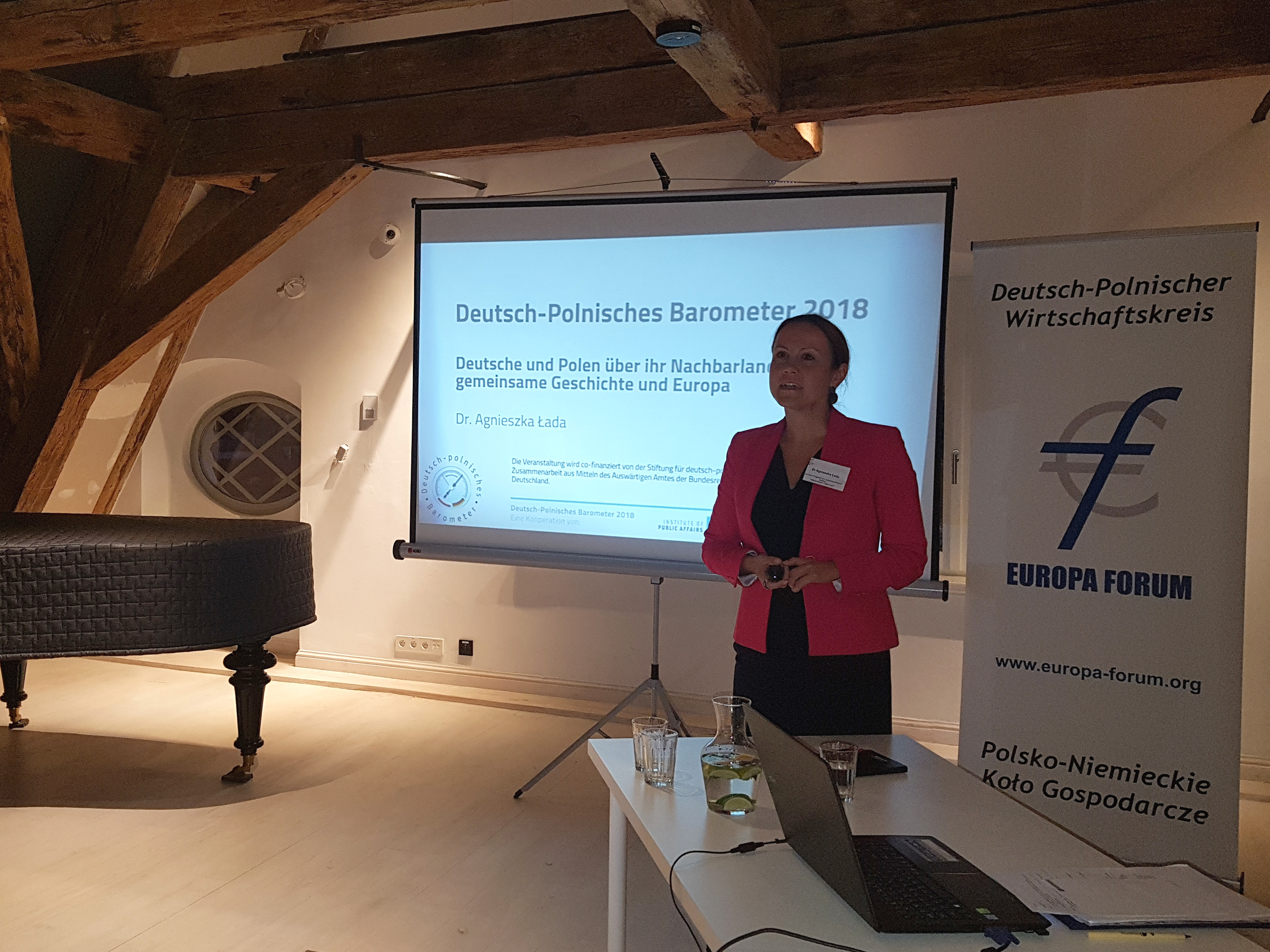Tegoroczne wyniki Barometru przedstawiła politolożka dr Agnieszka Łada – dyrektor Programu Europejskiego w niezależnym ośrodku badawczo-analitycznym, jakim jest Instytut Spraw Publicznych. Wyniki Barometru są merytorycznie bardzo dobrym punktem wyjścia i podstawą do wspólnej refleksji na temat stosunków polsko-niemieckich, postrzegania kraju sąsiada i aktualnej w nim sytuacji.