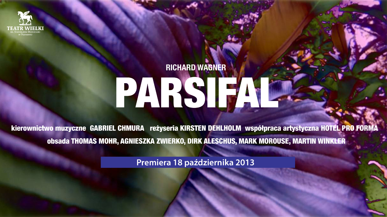 Ostatnie z wielkich dzieł kompozytora, w sposób doskonały realizujące głoszoną przez niego koncepcję syntezy sztuk. To w całości stworzone przez Richarda Wagnera misterium sceniczne łączy w sobie aurę mistycyzmu z monumentalną siłą. W Parsifalu dokonuje się próba powrotu do źródeł wszelkich religii, z których przecież zrodził się teatr. Maestro Gabriel Chmura, obecnie jeden z wybitniejszych dyrygentów symfonicznych i operowych, dyrektor artystyczny poznańskiej opery, obejmie kierownictwo muzyczne nad spektaklem. Autorstwo reżyserii oraz koncepcji scenograficznej należy do duńskiej grupy HOTEL PRO FORMA, którą tworzą Kirsten Dehlholm, Jon R. Skulberg oraz Iury Trojaborg. Struktura prac reżysersko-inscenizacyjnych tego zespołu opiera się na muzyce, sztuce wizualnej oraz architekturze i daleko odbiega od konwencjonalnej formy teatralnej. Projekty zespołu bazują na eksperymentalnych technologiach audio-wizualnych oraz iluminacjach świetlnych. Jest to pierwsza produkcja Hotelu Pro Forma w pełni realizowana na zamówienie polskiej sceny operowej. Honorowy patronat Ambasador Niemiec Rüdiger Freiherr von Fritsch Ambasador Danii Steen Hornmel