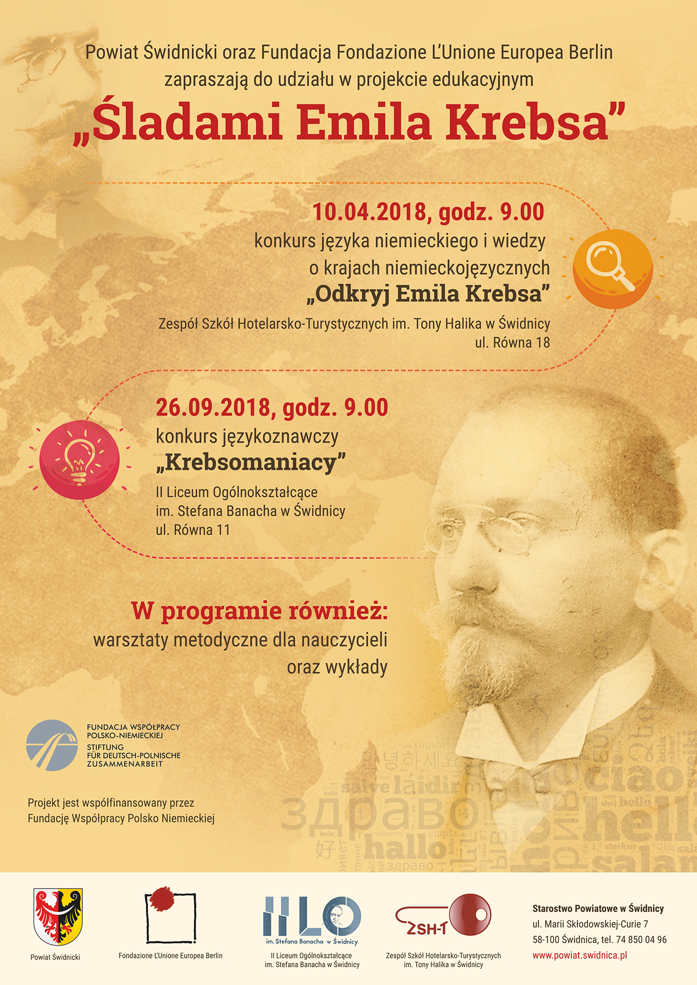Projekt „Śladami Emila Krebsa” zostanie zrealizowany w terminie 09.04 -27.09.2018 w Świdnicy (województwo dolnośląskie). W jego ramach odbędą się konkursy językowe, warsztaty metodyczne dla nauczycieli języka niemieckiego z zakresu innowacyjnych metod nauczania oraz wykłady. Konkurs języka niemieckiego pn. „Odkryj Emila Krebsa” będzie miał miejsce już 10 kwietnia w Zespole Szkół Hotelarsko-Turystycznych im. Tony Halika w Świdnicy, natomiast konkurs językoznawczy „Krebsomaniacy” odbędzie się w II Liceum Ogólnokształcącym im. Stefana Banacha w Świdnicy w dniu 26 września. Partnerami projektu są Powiat Świdnicki oraz Fundacja Fondazione L ’Unione Europea z Berlina. Projekt dofinansowała Fundacja Współpracy Polsko-Niemieckiej.