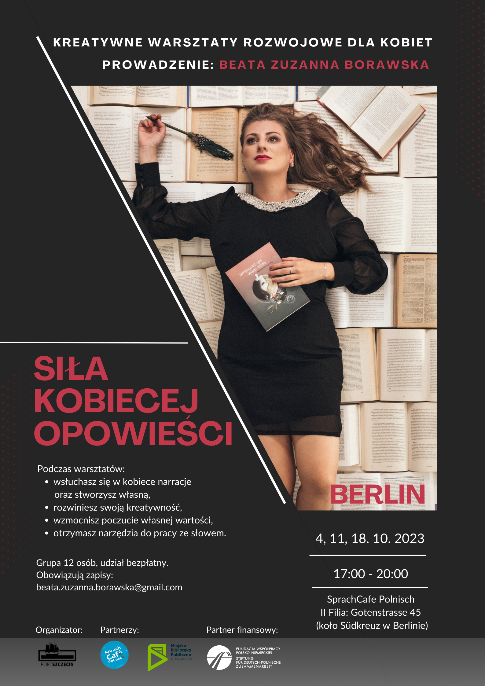 Udział w spotkaniach jest bezpłatny, ale obowiązują zapisy. Zgłoszenia należy przesłać mailowo na adres – beata.zuzanna.borawska@gmail.com – w tytule wpisując miasto Szczecin lub Berlin. Liczba miejsc ograniczona (grupy 12 osobowe).
