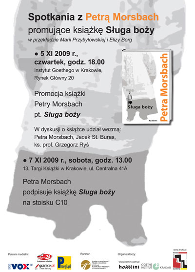 Goethe-Institut w Krakowie, Fundacja S. Fischer Stiftung oraz Wydawnictwo Homini zapraszają na spotkanie z pisarką niemiecką Petrą Morsbach autorką powieści "Sługa boży" przekład Maria Przybyłowska i Eliza Borg, Wydawnictwo Homini, Kraków 2009 z udziałem ks. prof. Grzegorza Rysia, rektora Wyższego Seminarium Duchownego w Krakowie, i Jacka St. Burasa, współredaktora serii KROKI/SCHRITTE. Prowadzenie Krzysztof Bielawski, Wydawnictwo Homini