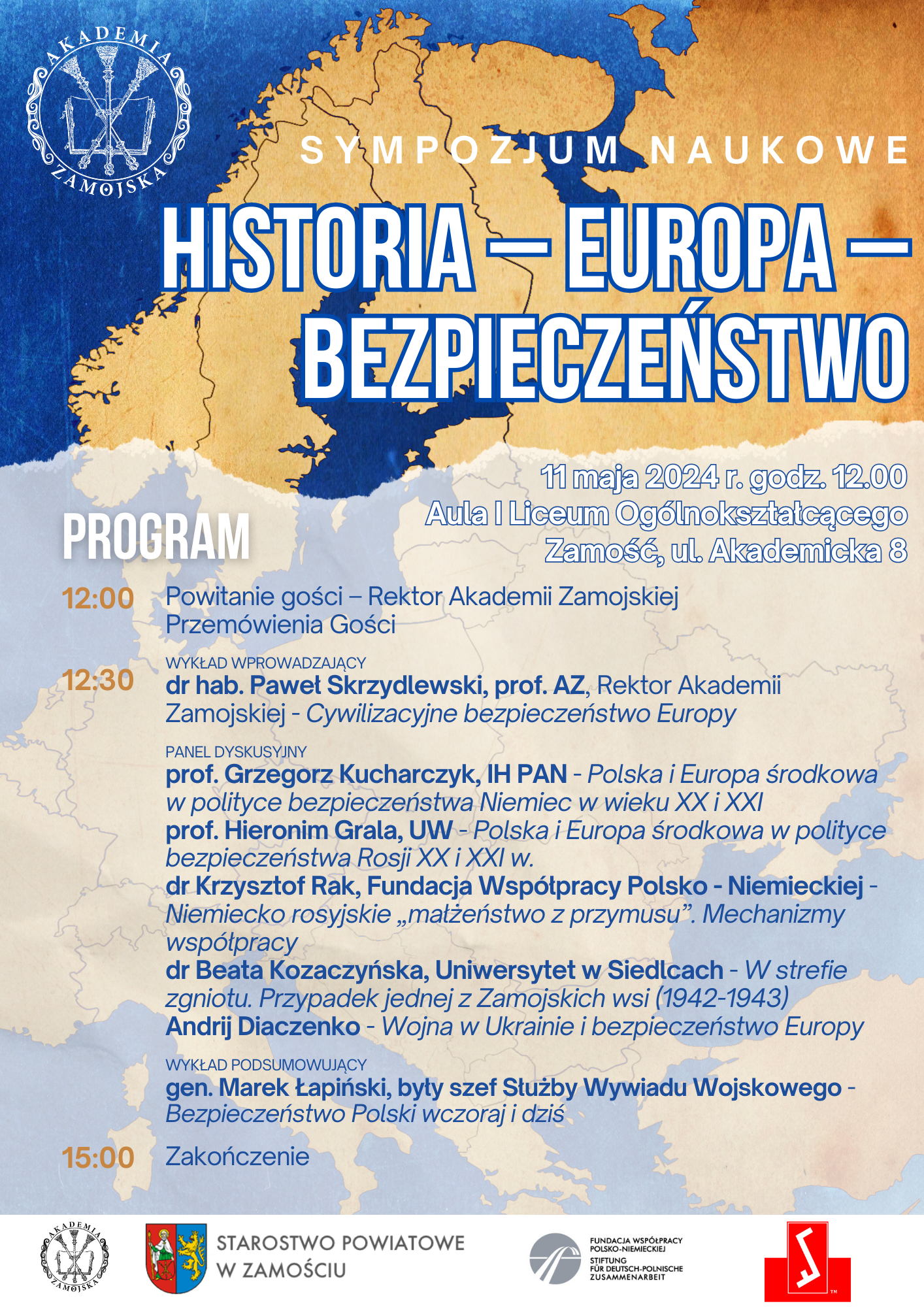 Akademia Zamojska i Starostwo Powiatowe w Zamościu we współpracy z Fundacją Współpracy Polsko-Niemieckiej oraz Związkiem Polaków w Niemczech zapraszają na sympozjum naukowe „Historia – Bezpieczeństwo -Europa”.