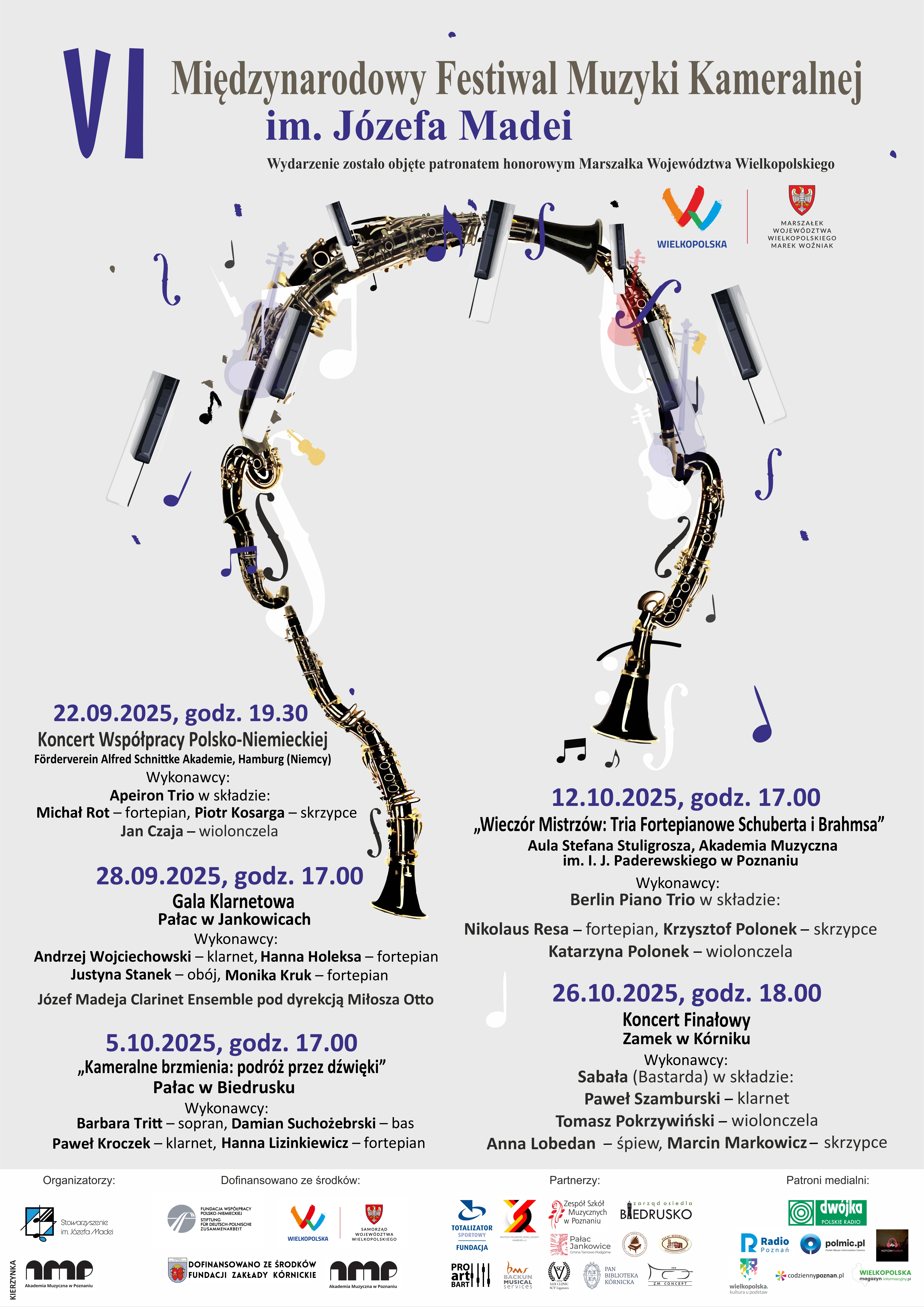 22 września w Hamburgu w Alfred Schnittke Akademie odbędzie się wyjątkowy Koncert Inauguracyjny Festiwalu. Będzie to koncert współpracy polsko-niemieckiej organizowany wspólnie z Deutsch-Polnischen Gesellschaft Hamburg oraz CATOIRE music initiatives. Wykonawcami koncertu będzie zespół Apeiron Trio w składzie: Michał Rot – fortepian (gościnnie), Piotr Kosarga – skrzypce oraz Jan Czaja – wiolonczela. 28 września w Pałacu Jankowice podczas „Gali Klarnetowej” wystąpi orkiestra klarnetowa – Józef Madeja Clarinet Ensemble, którą poprowadzi Miłosz Otto. Ponadto wystąpią znakomite duety: klarnecista Andrzej Wojciechowski z towarzyszeniem pianistki Hanny Holeksy, a także Justyna Stanek – obój i Monika Kruk – fortepian. 5 października w Pałacu Biedrusko podczas koncertu „Kameralne brzmienia: podróż przez dźwięki” wystąpią artyści: Barbara Tritt – sopran, Damian Suchożebrski – bas, Paweł Kroczek – klarnet oraz Hanna Lizinkiewicz – fortepian. 12 października w Auli Stuligrosza Akademii Muzycznej im. Ignacego Jana Paderewskiego w Poznaniu odbędzie się święto muzyki kameralnej – podczas koncertu wystąpi Berlin Piano Trio, w składzie Nikolaus Resa – fortepian, Krzysztof Polonek – skrzypce, Katarzyna Polonek – wiolonczela. 26 października w Zamku w Kórniku podczas Koncertu Finałowego, wystąpią z projektem muzycznym „Sabała” członkowie Bastarda Trio: Paweł Szamburski – klarnet, Tomasz Pokrzywiński – wiolonczela oraz zaproszeni goście: Anna Lobedan – śpiew i Marcin Markowicz – skrzypce.