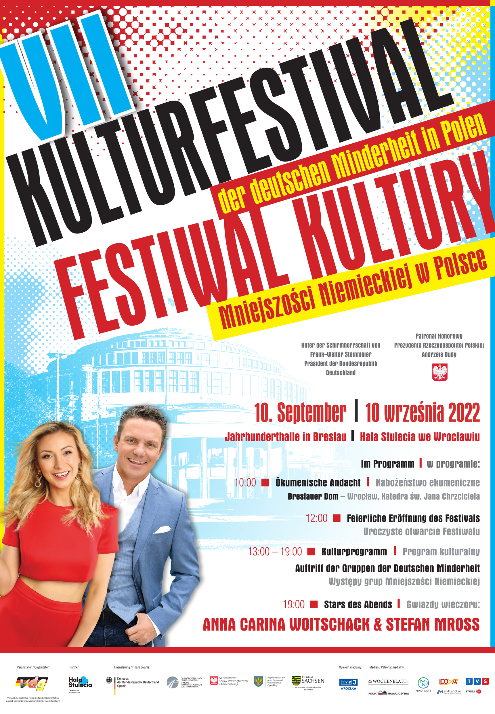 Organizowany co trzy lata w Hali Stulecia we Wrocławiu Festiwal Kultury Mniejszości Niemieckiej ma zaprezentować szerokiej publiczności bogactwo oferty kulturalnej mniejszości niemieckiej, począwszy od muzyki chóralnej, popu i jazzu, arii operowych i musicalowych evergreenów, poprzez szlagiery, orkiestry dęte, zespoły wokalne aż po taniec. W minionym roku, ze względu na pandemię, Festiwal niestety nie mógł się odbyć, w tym roku jednak cieszymy się, mogąc zaprosić Państwa na wyczekiwane tak długo wydarzenie: 10 września 2022 we Wrocławiu.