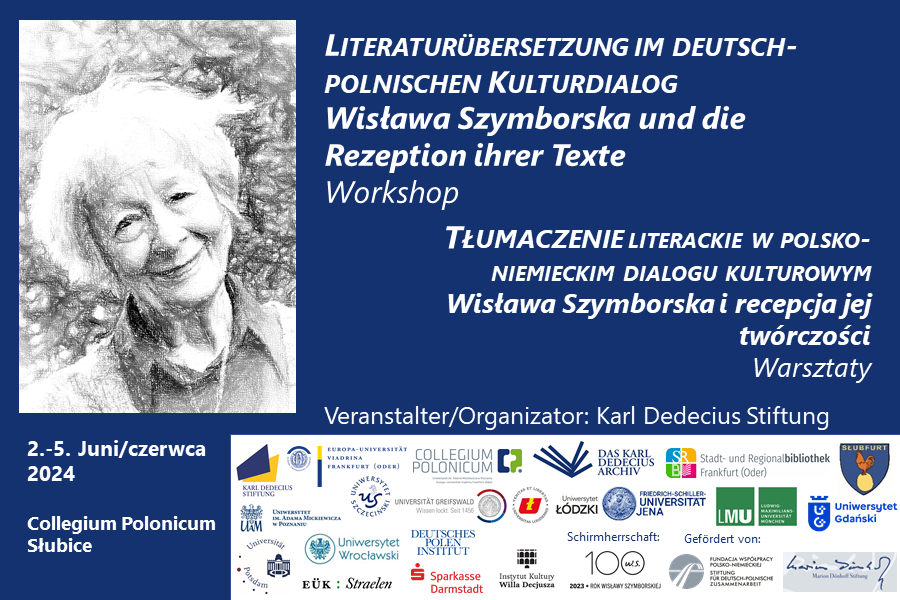 Od 2016 r. polsko-niemieckie warsztaty "Przekład literacki w polsko-niemieckim dialogu kulturowym" służą nawiązywaniu i pogłębianiu współpracy między przyszłymi polskimi germanistami i niemieckimi polonistami. W centrum tegorocznego projektu znajduje się biografia i twórczość W. Szymborskiej. Wprowadzeniem w atmosferę warsztatów będzie prezentacja filmu o poetce "Chwilami życie bywa znośne". Następnie studenci będą pracować w polsko-niemieckich tandemach nad różnymi tematami (np. korespondencją poetki z K. Dedeciusem czy recepcją jej poezji z muzyce) i zadaniami (np. tłumaczeniem i konceptualizacją wystaw o poetce). Z tłumaczami literatury Elżbietą Kalinowską i Andreasem Volkiem (laureatami Nagrody im. K. Dedeciusa) pochylą się nad tekstami literackimi i zapoznają ze specyfiką przekładu literackiego. W Archiwum K. Dedeciusa otrzymają dostęp do kolekcji rękopisów W. Szymborskiej. Podczas spotkania z M. Kurzwellym poznają tajniki dialogu międzykulturowego.